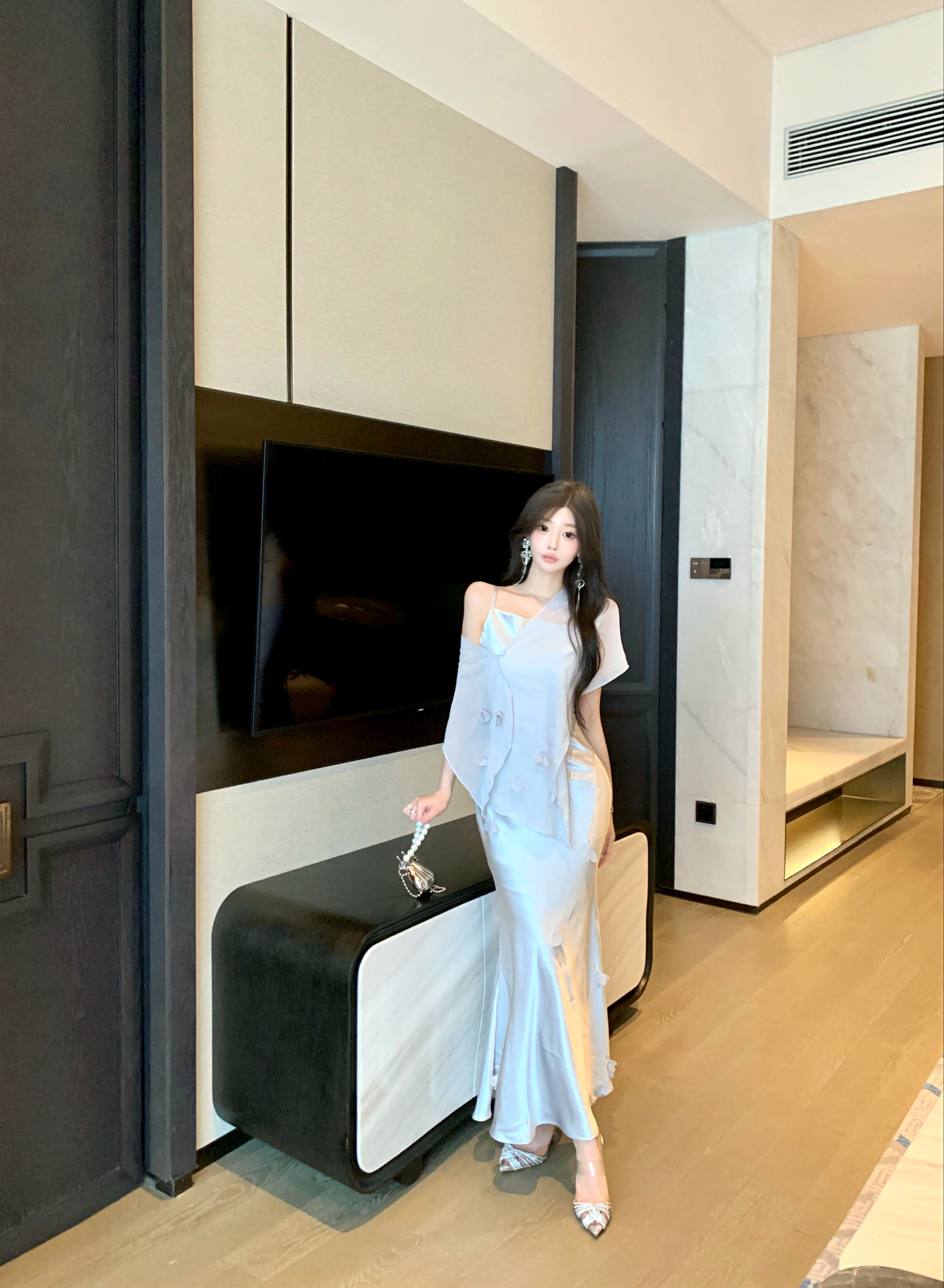 실사 부드러운 바람 새틴 백리스 몸매 가꾸기 인어 꼬리 드레스 여름 품격 고급 센스 흔들다 칼라 데이트 예복 롱 스커트