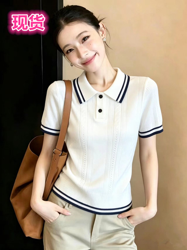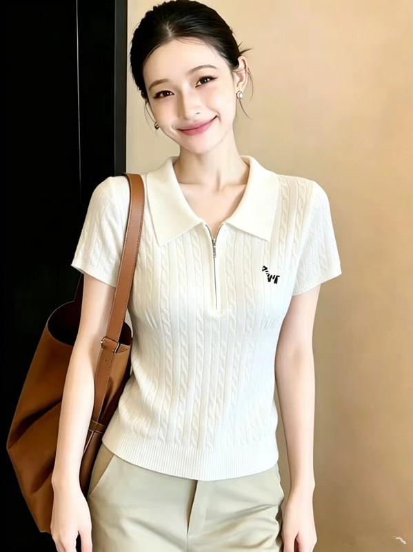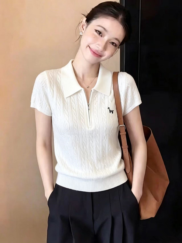 화이트 POLO 칼라 꽈배기 니트 스웨터 얼음 실크 반팔 여성 여름 다용도 티셔츠 긍정적 인 어깨 슬림해 보이는 맨위