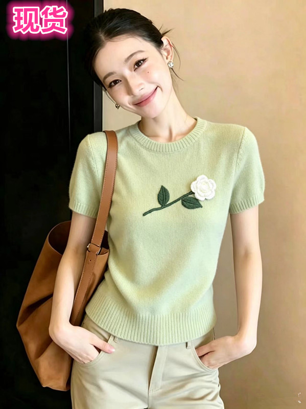 2026 여름 새로운 한국 스타일 꽃 장식 니트 반팔 맨위 여성 여름 고급 센스 품격 Chic 티셔츠
