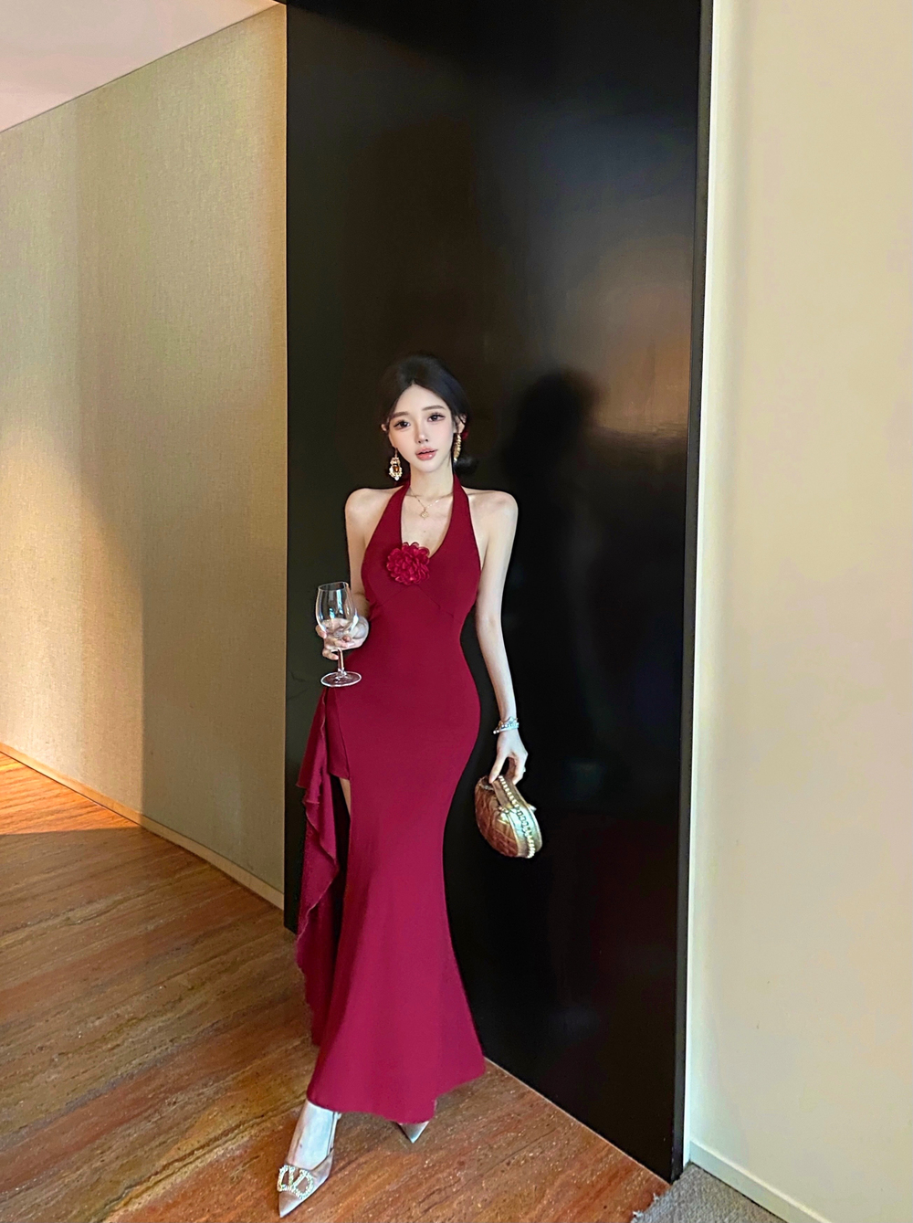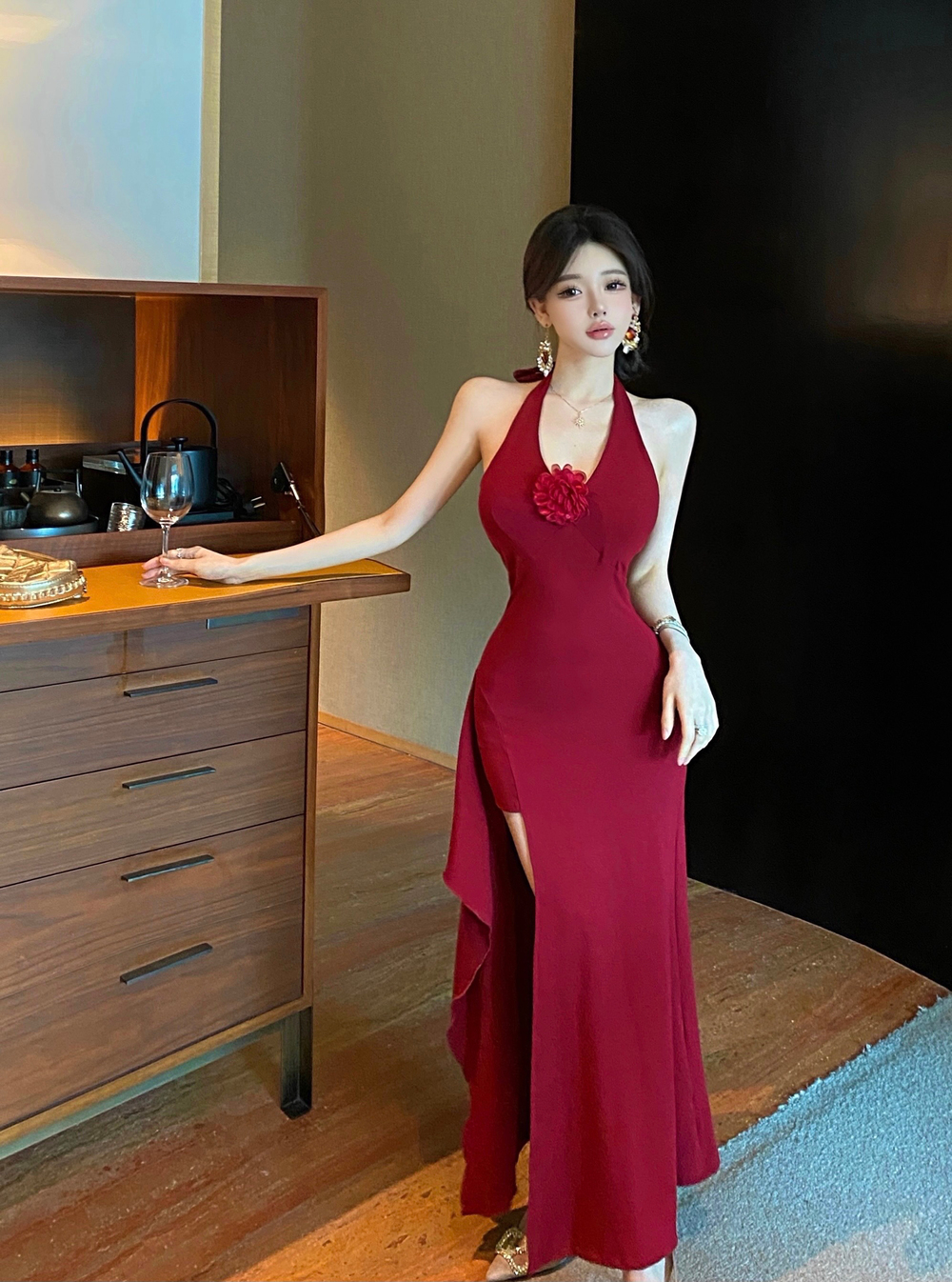 실사 로얄 자매 감정 트임 드레스 프랑스식 아름다운 고유 한 빨간색 행침 목 V넥 타이트 스커트 기본 스커트