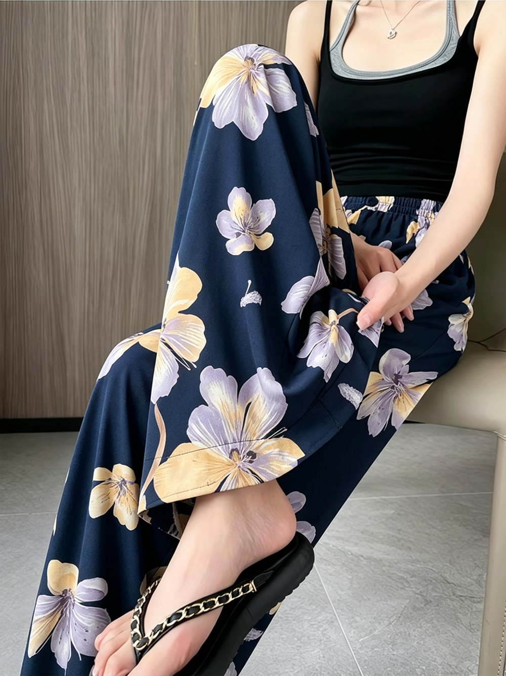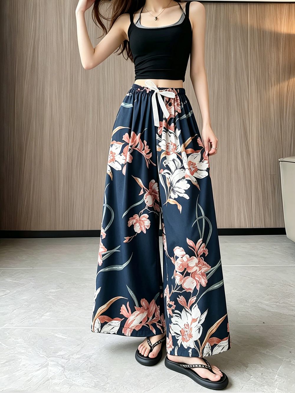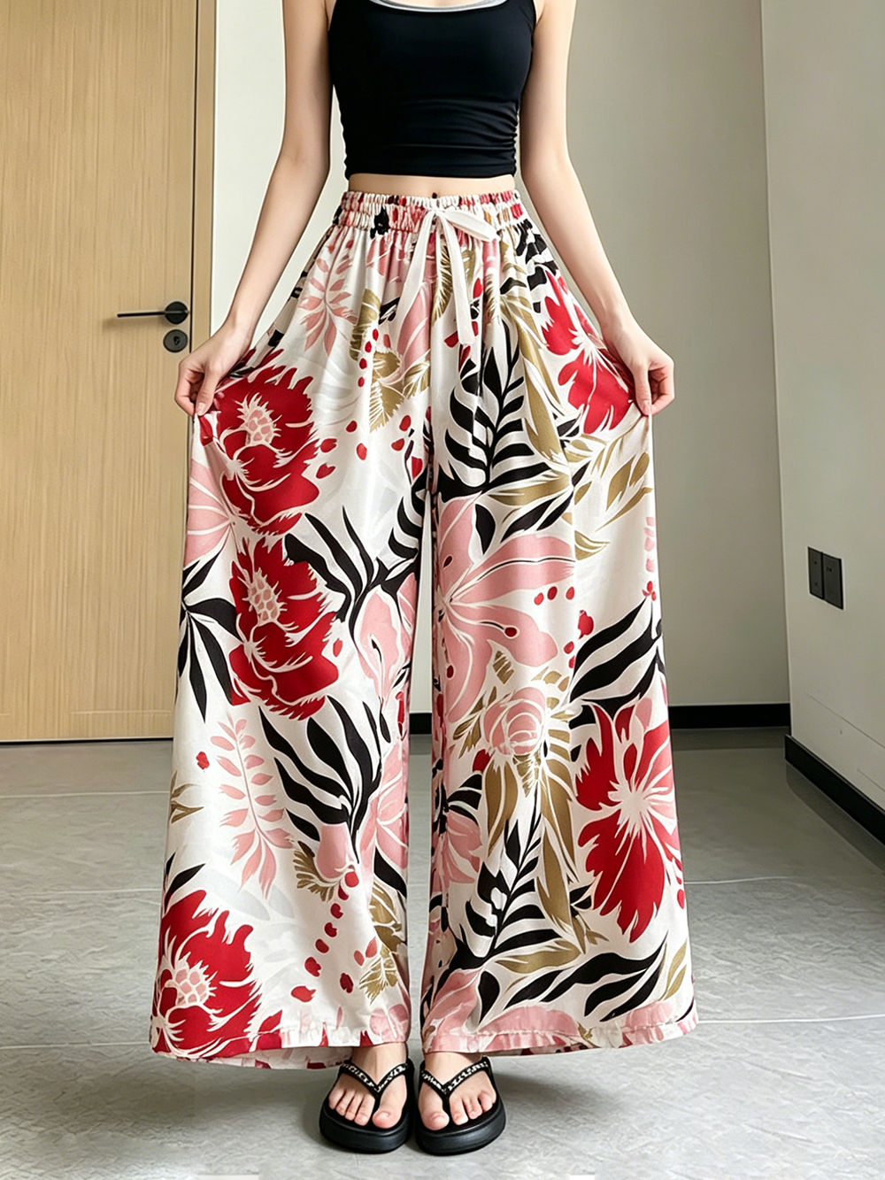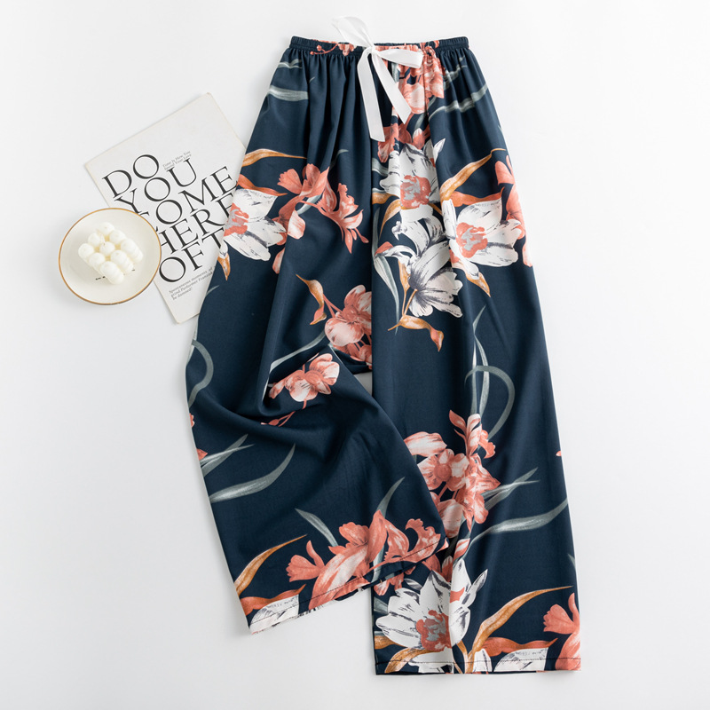 일본과 한국 트렌드 와이드 레그 팬츠 보헤미안 면 실크 루즈핏 캐주얼 바지 여성 자외선 차단 슬림해 보이는 프린트 롱 바지