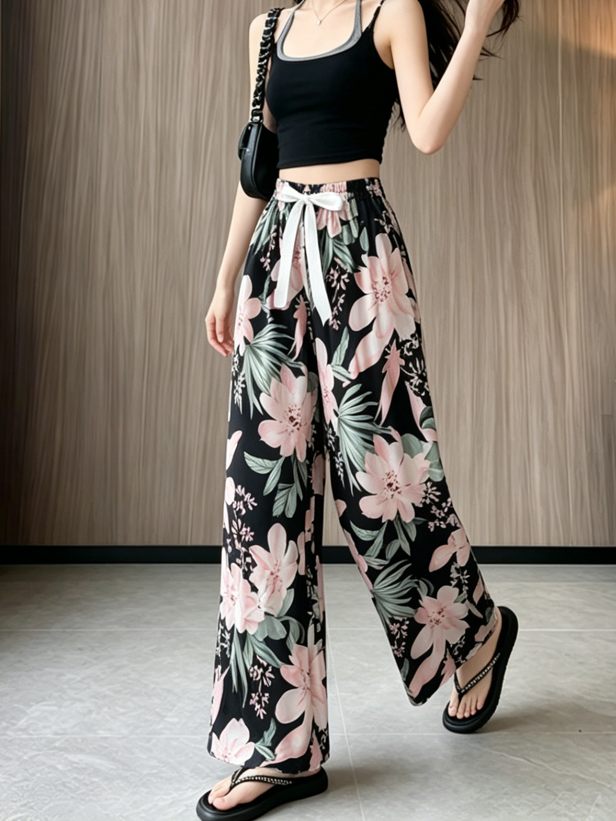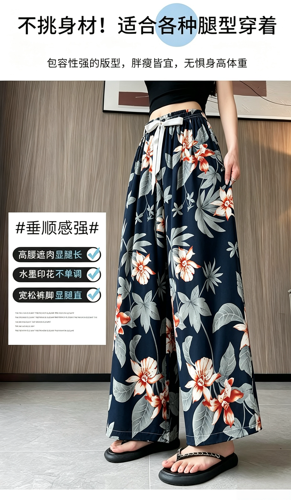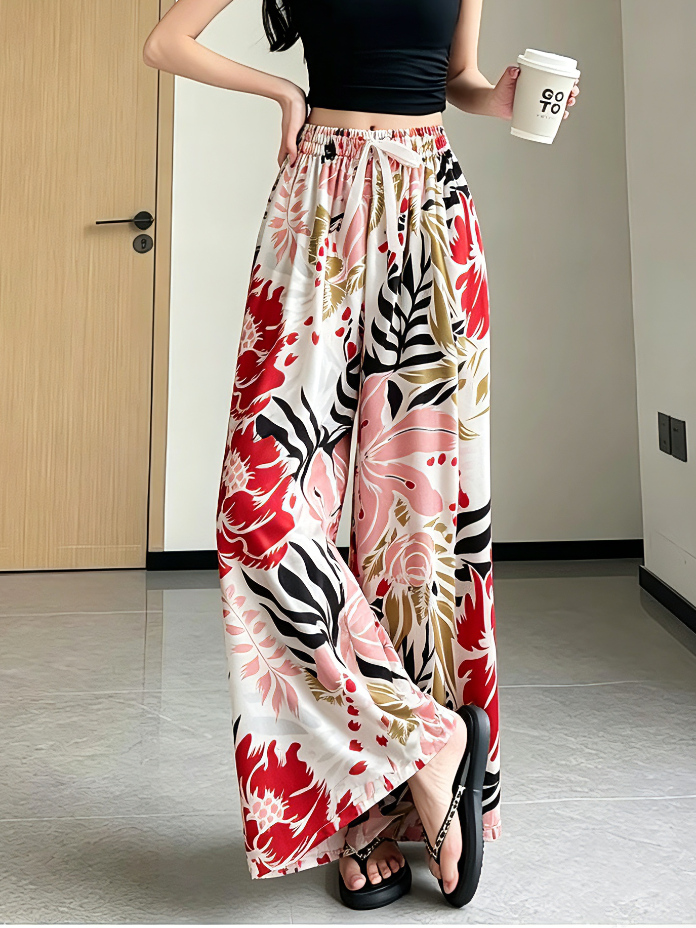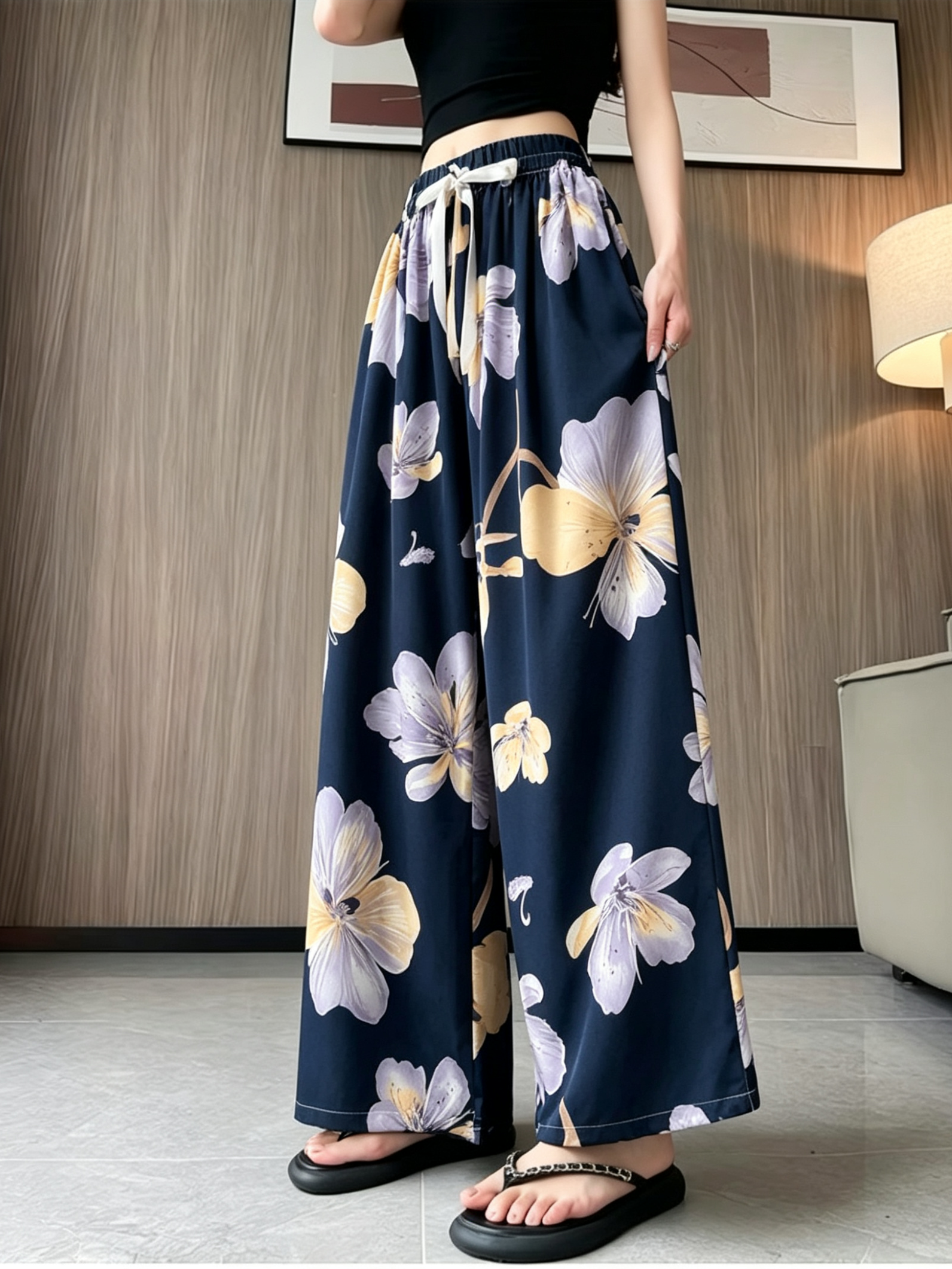 일본과 한국 트렌드 와이드 레그 팬츠 보헤미안 면 실크 루즈핏 캐주얼 바지 여성 자외선 차단 슬림해 보이는 프린트 롱 바지
