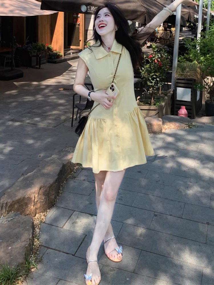 프랑스식 부드러운 황색 POLO 칼라 허리 수축 여성 드레스 여름 민소매 디자인 센스 연령 감소 작은 키 조끼 미니 스커트