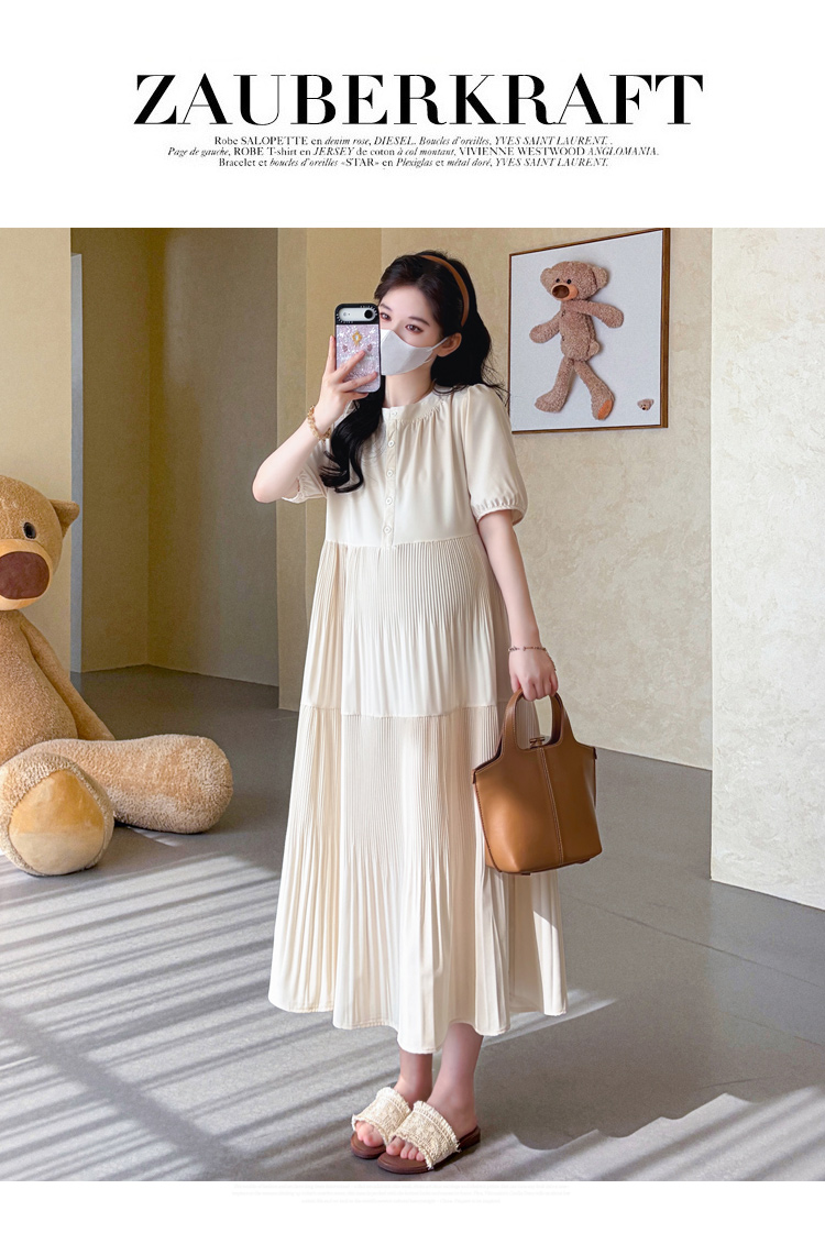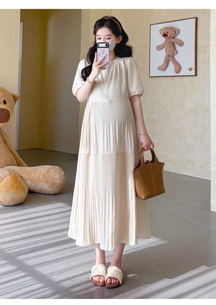 지금 실사 2026 여름 임산부 새로운 디자인 센스 V넥 끈 수신 Pleat 슬림해 보이는 부드러운 롱 코트 드레스