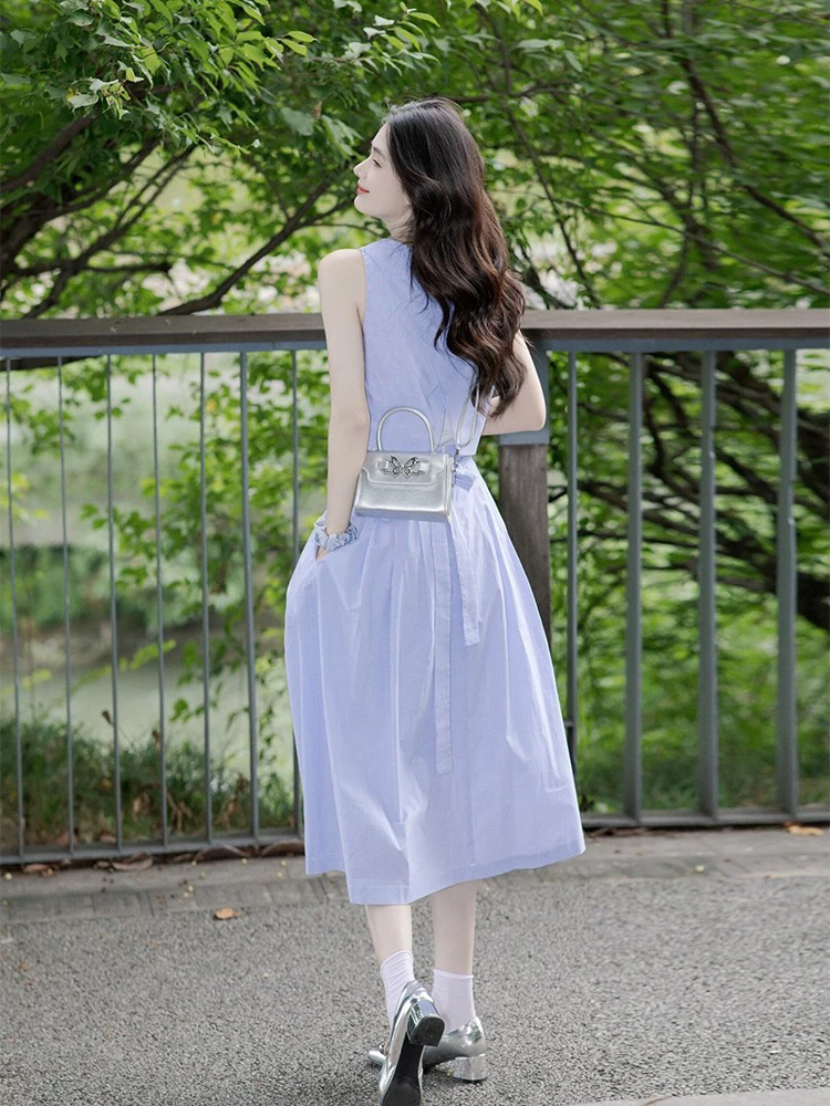 프랑스식 부드러운 바람 보라색 민소매 조끼 여성 드레스 여름 작은 키 연령 감소 허리 수축 투피스 슈트 치마