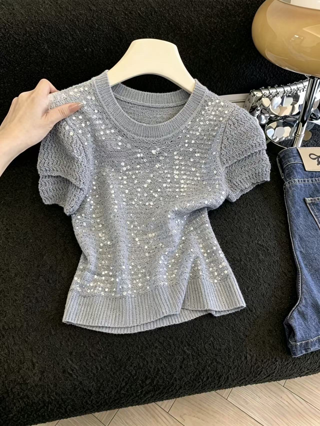 실사 무거운 작업 스팽글 꽃밭 소매 짠 셔츠 티셔츠 여성 여름 새로운 작은 키 외국 가스 연령 감소 맨위 chic