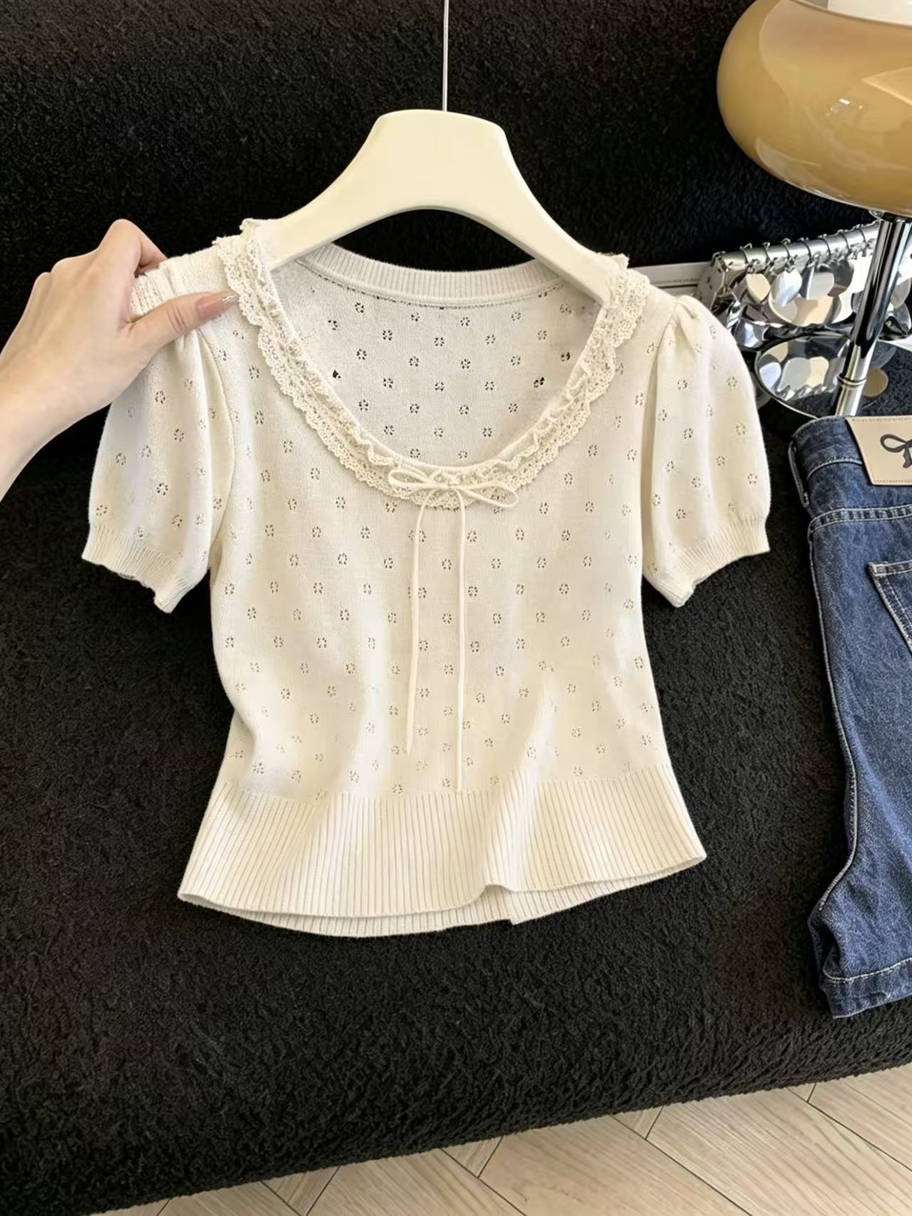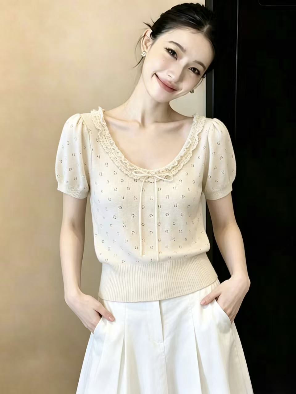 실사 아름다운 나비 매듭 프랑스식 홀로우 아웃 얼음 실크 니트 반팔 티셔츠 여성 레이스 레이스 쇼트 스타일 작은 셔츠 맨위