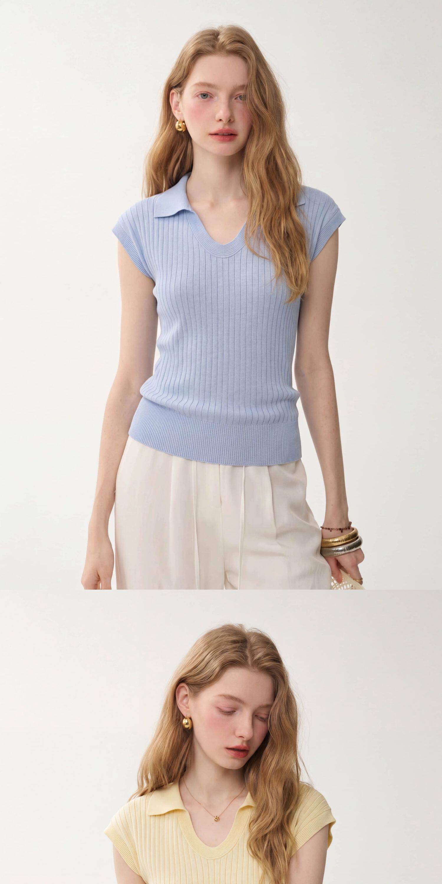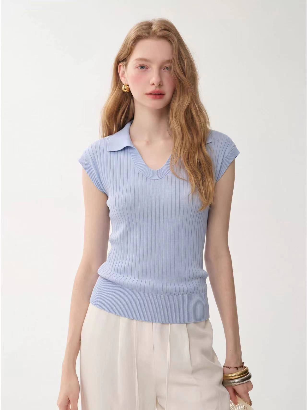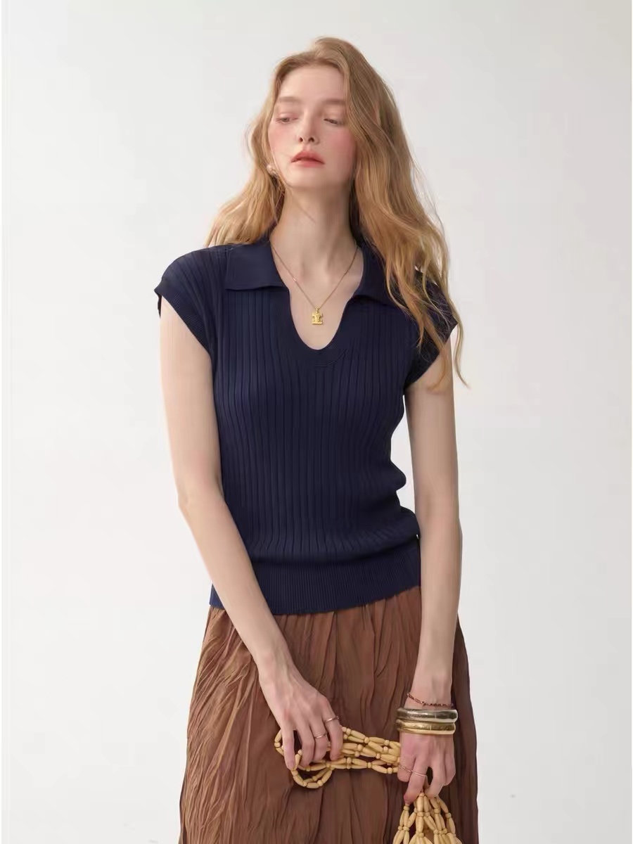 고급 센스 미니멀리즘 품격 파란색 슬림해 보이는 V넥 니트 스웨터 티셔츠 여성 여름 작은 날다 소매 POLO 셔츠 얼음 실크 맨위
