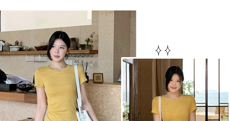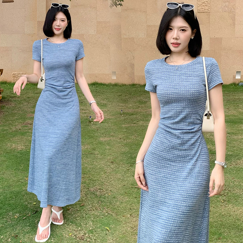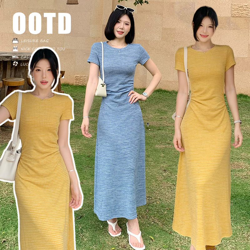 2026 년 임산부 여름 디자인 센스 주름 허리 수축 라운드 넥 반팔 슬림해 보이는 캐주얼 드레스