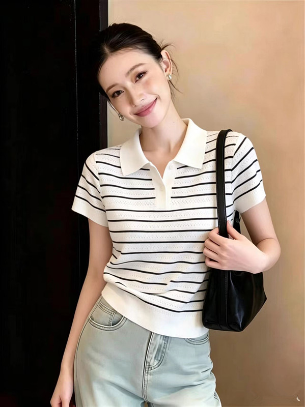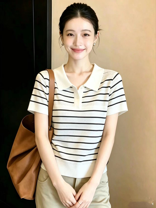 새로운 2026 여름 패션 배색 스트라이프 POLO 칼라 얼음 실크 니트 반팔 출퇴근 맨위 여성