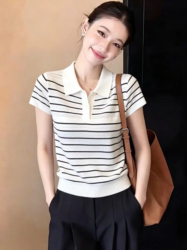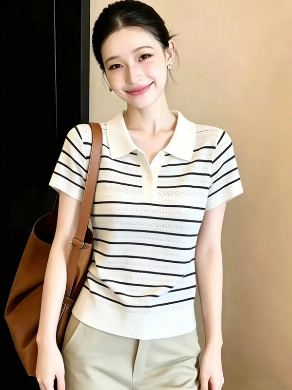 2026 여름 새로운 여성 패션 출퇴근 다용도 스트라이프 반팔 니트 스웨터 외국 가스 연령 감소 plo 칼라 맨위