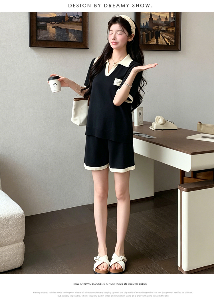 여름 새로운 루즈핏 다용도 임산부 세트 배색 V넥 맨위 반바지 투피스 슈트