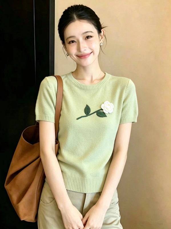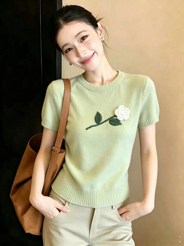 2026 여름 새로운 한국 스타일 꽃 장식 니트 반팔 맨위 여성 여름 고급 센스 품격 Chic 티셔츠