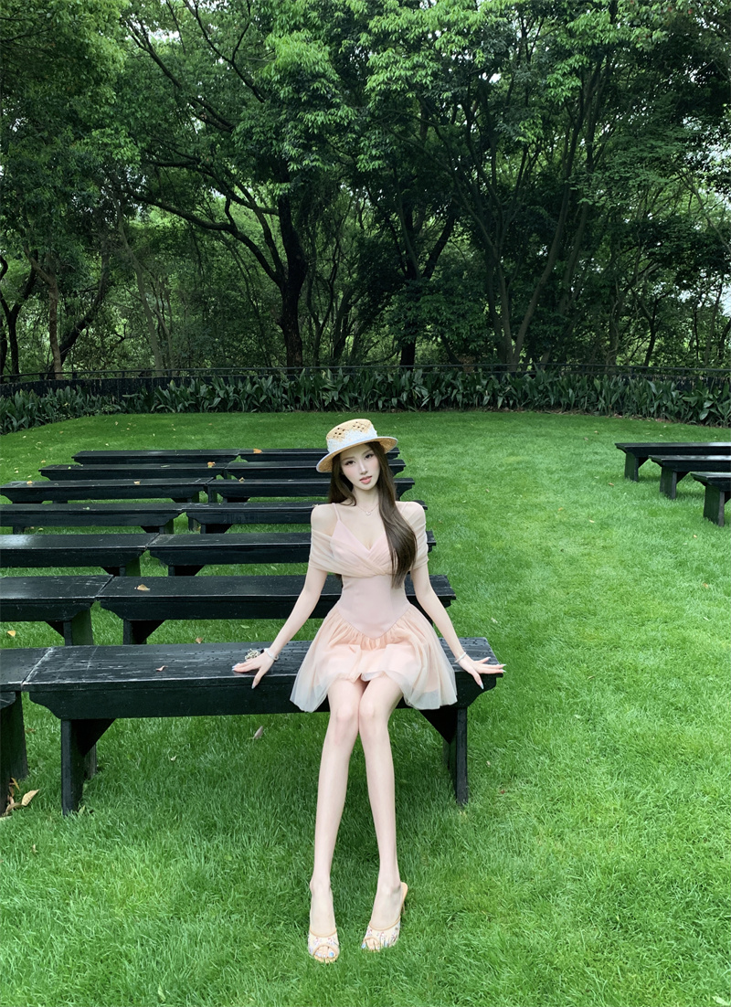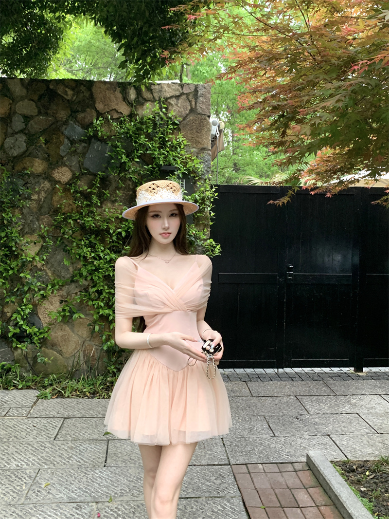 실사 부드러운 순수한 욕망 발레 센스 달콤함 품격 십자가 망사 패치워크 허리 수축 드레스 데이트 생일 미니 스커트