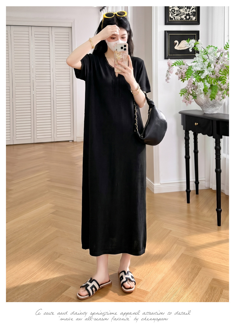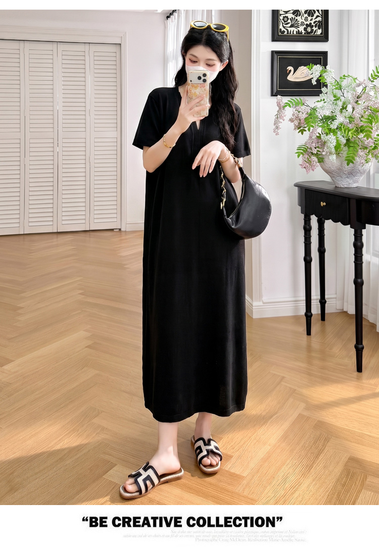실사 2026 여름 드레스 출산 착용 새로운 반팔 니트 원피스 중간 길이 캐주얼 루즈핏 트렌디 엄마 슬림해 보이는 드레스