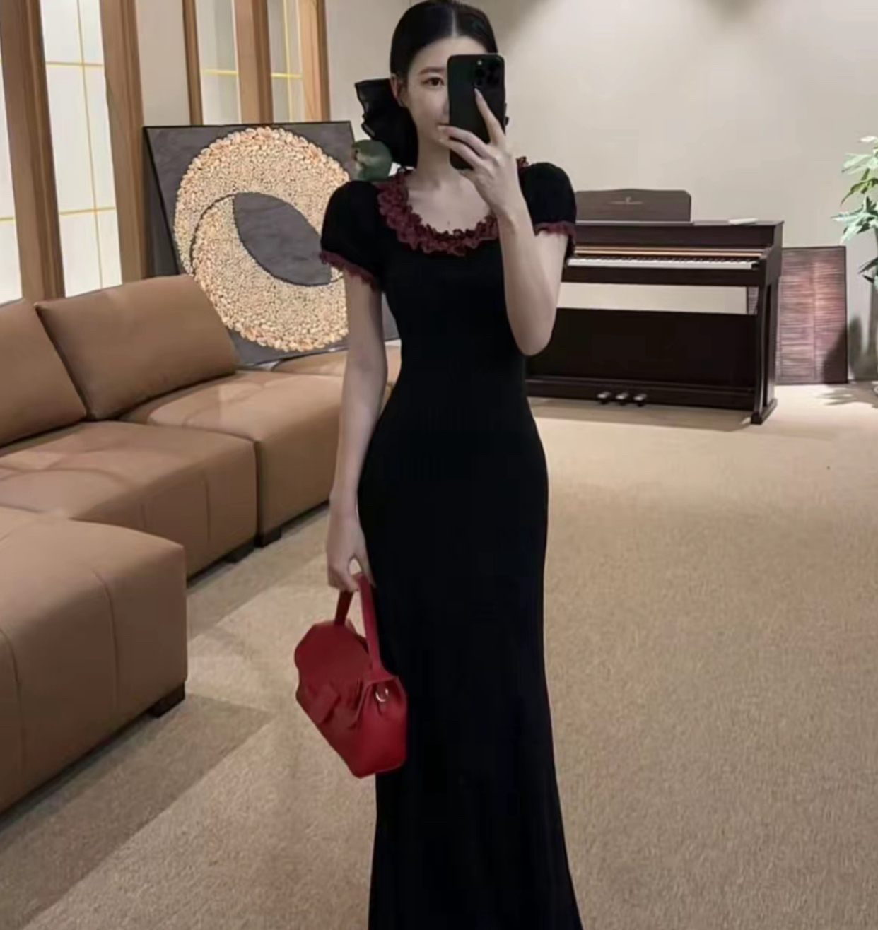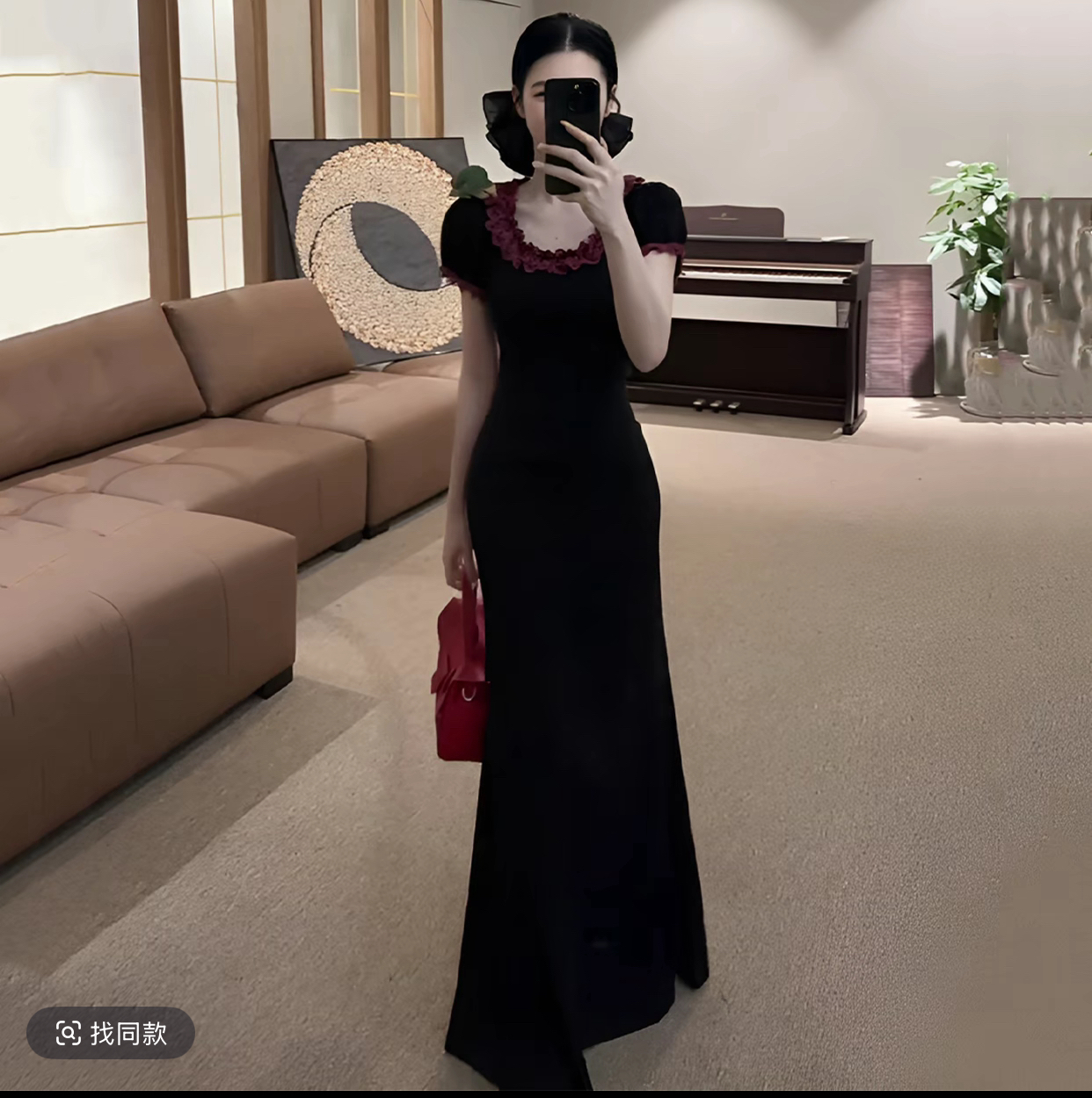 무쯔리 목자이 ~ 중 리 잉크 켜기 서리 꽃 품격 분위기 센스 홀로우 아웃 꽃 패치워크 새로운 중식 드레스