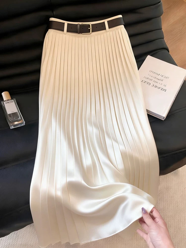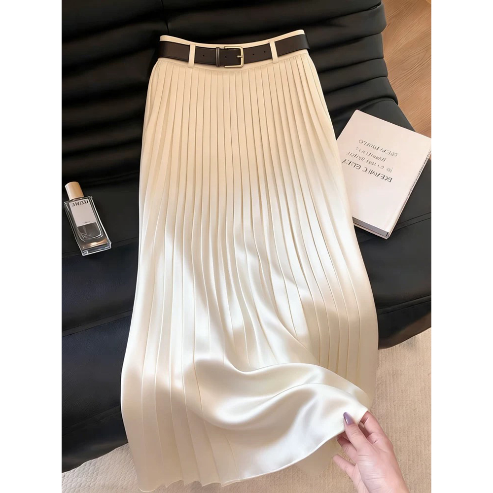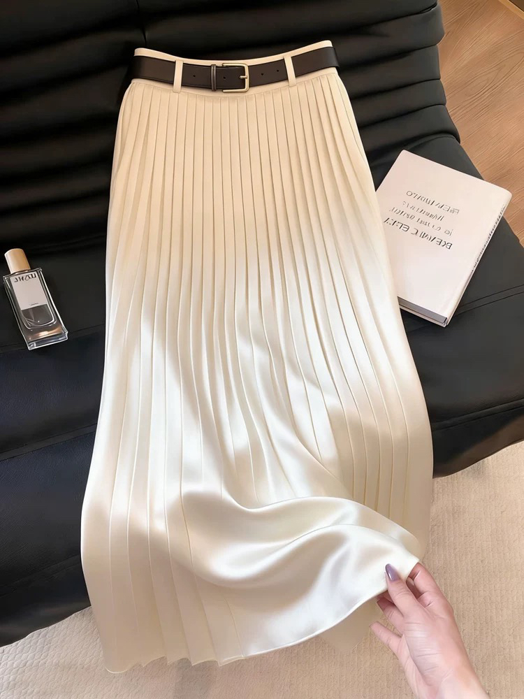 화이트 새틴 플리츠 스커트 여성 2026 여름 새로운 고급 센스 하이웨이스트 슬림해 보이는 품격 부드러운 연령 감소 반신 스커트