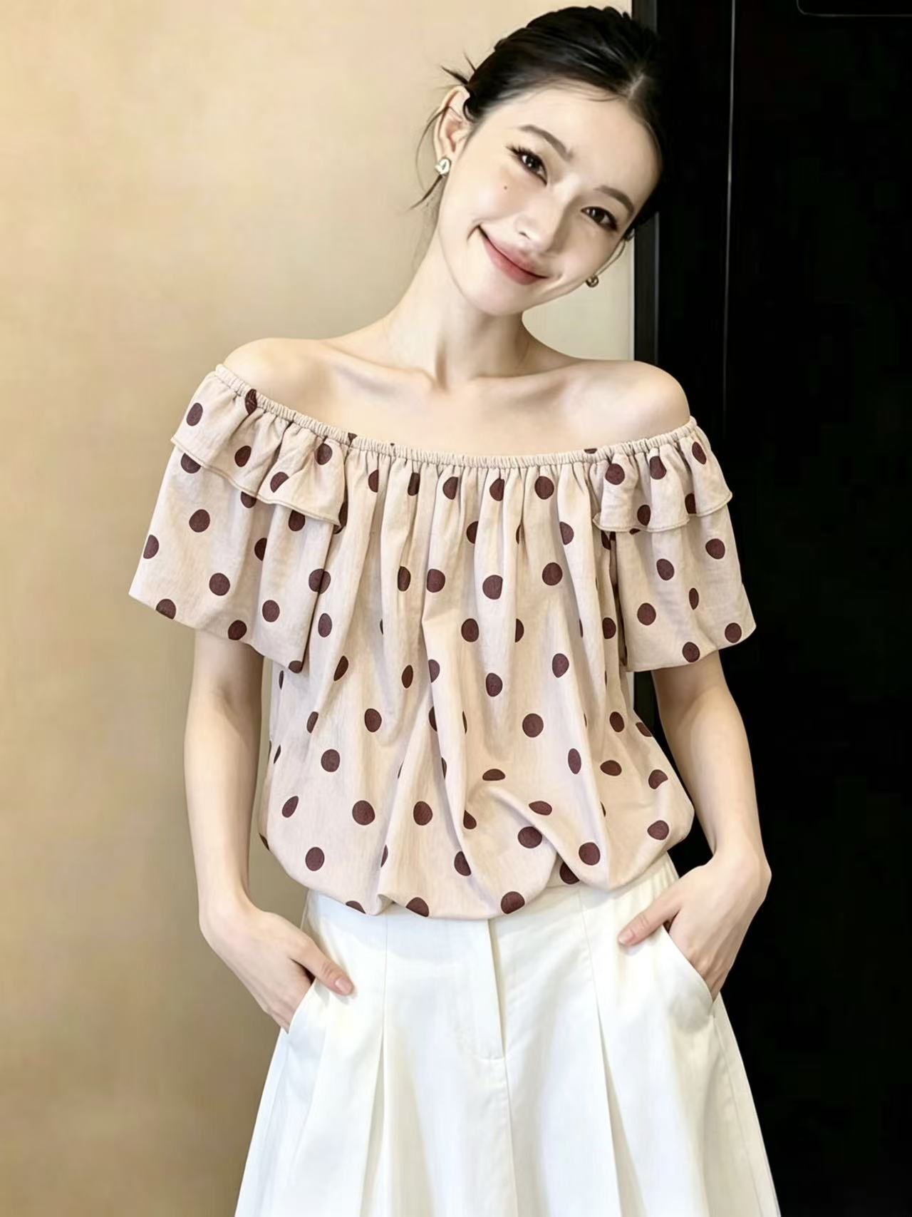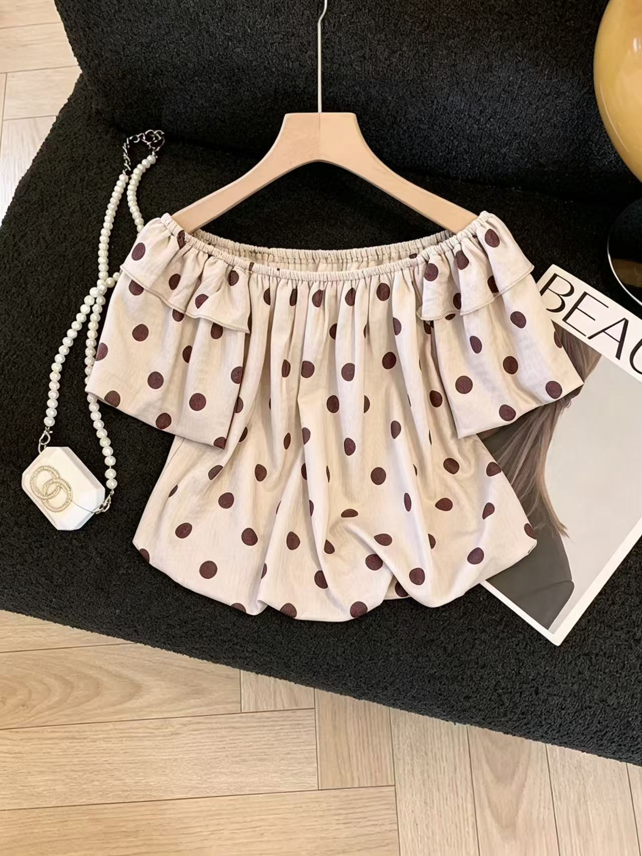 실사 프랑스식 휴가 바람 품격 착용 가져 가라. 주름 센스 오프숄더 도트 무늬 밴딩 맨위 여름 chic