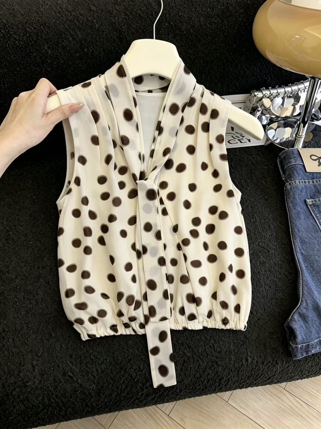 실사 프랑스식 고급 센스 품격 도트 무늬 V넥 민소매 셔츠 패션 루즈핏 연령 감소 다용도 맨위 chic