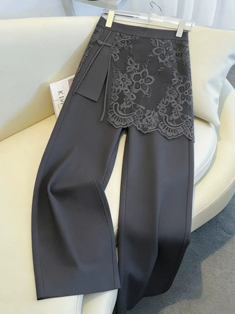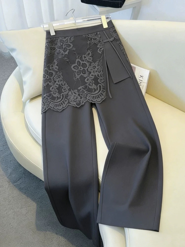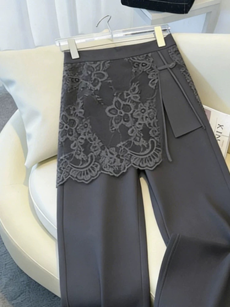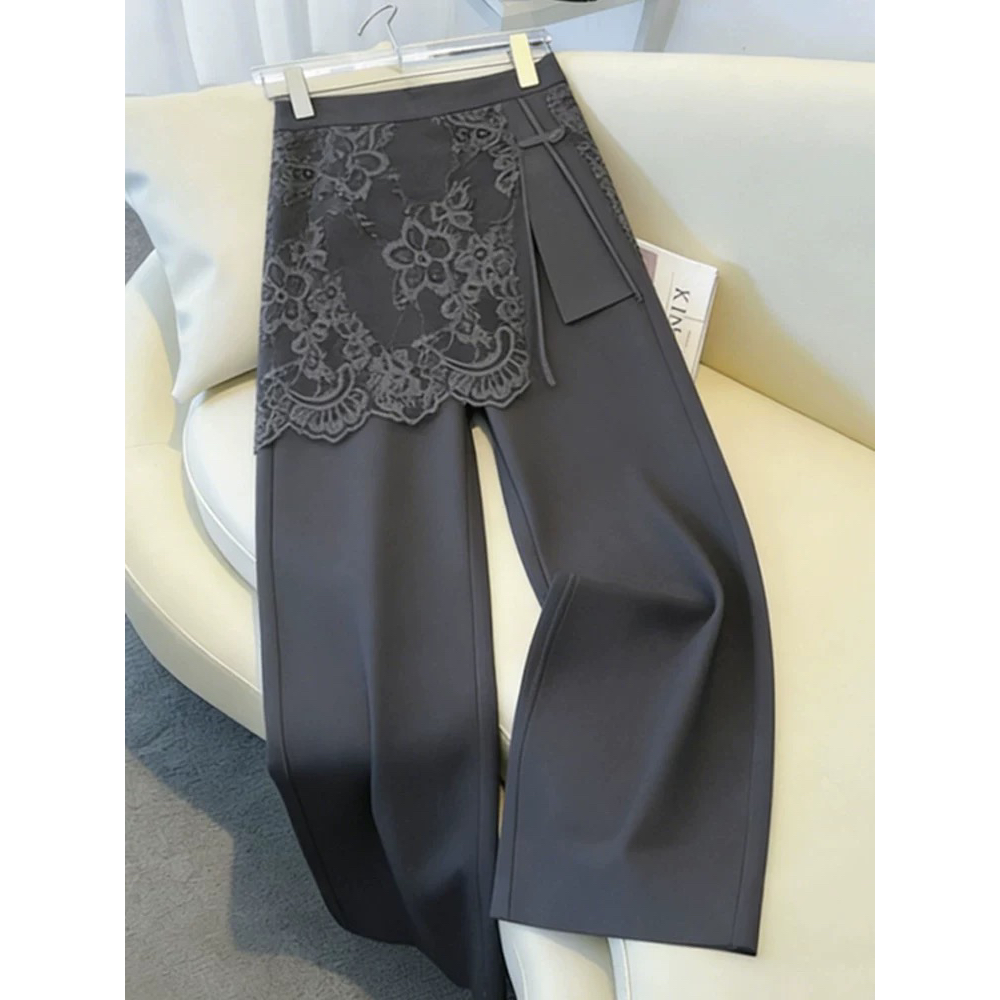 프랑스식 디자인 센스 회색 레이스 조각 페이크 레이어드 스트레이트 캐주얼 바지 여성 2026 올해 인기 다용도 긴 바지