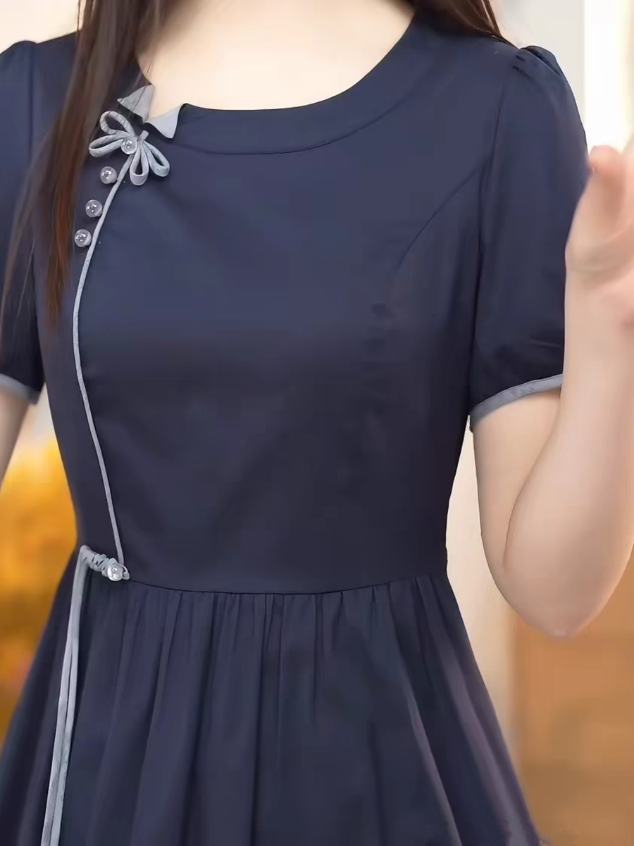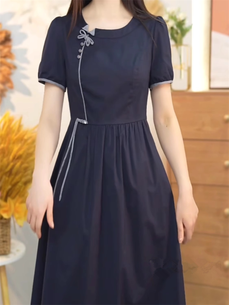 새로운 중식 국풍 연령 감소 품격 반팔 여성 드레스 2026 여름 새로운 중간 길이 외국 가스 슬림해 보이는 A라인 스커트