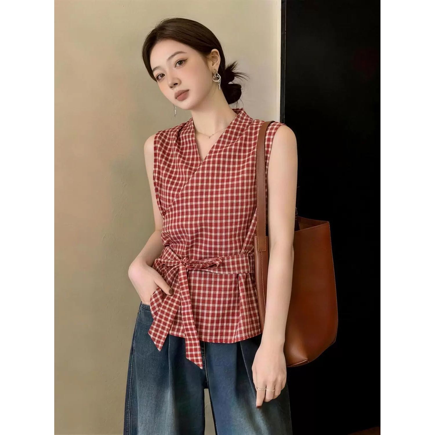 패션 프랑스식 V넥 레이스업 허리 수축 체크무늬 여성 셔츠 여름 빅 사이즈 통통한 여동생 출퇴근 품격 다용도 맨위