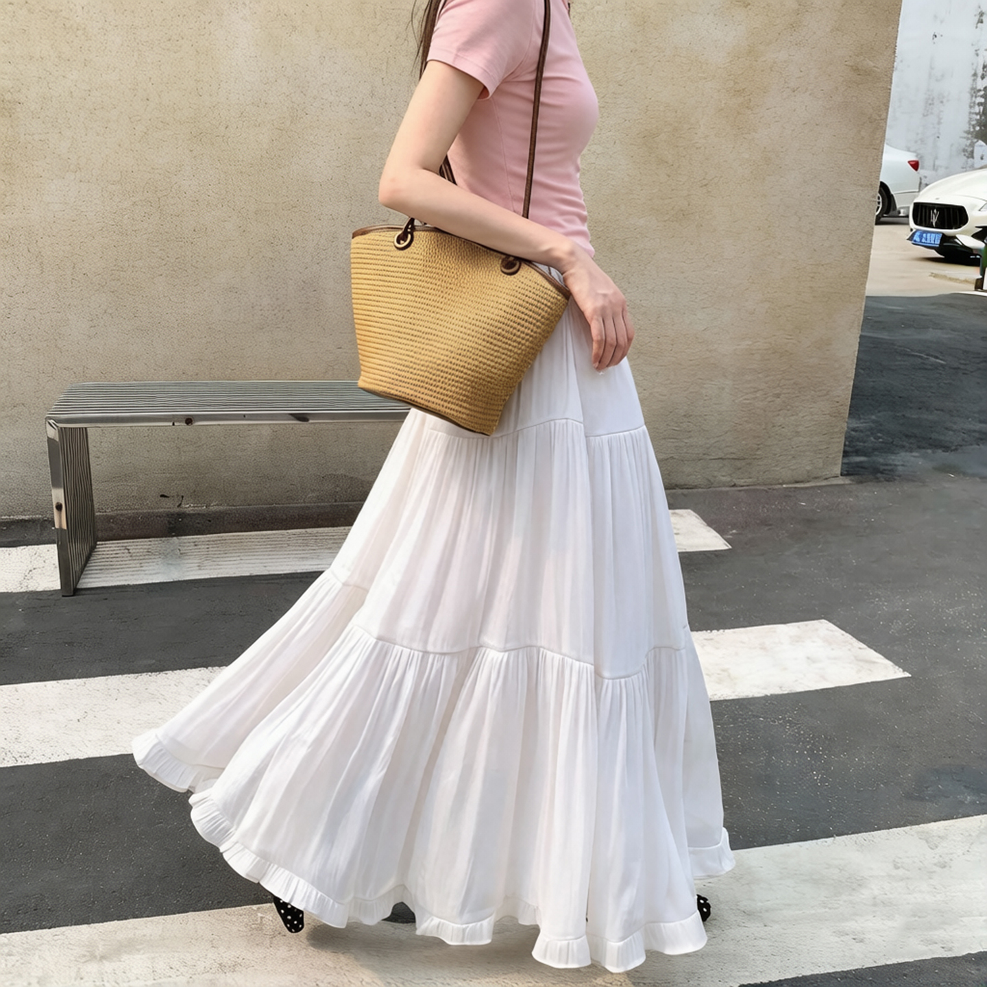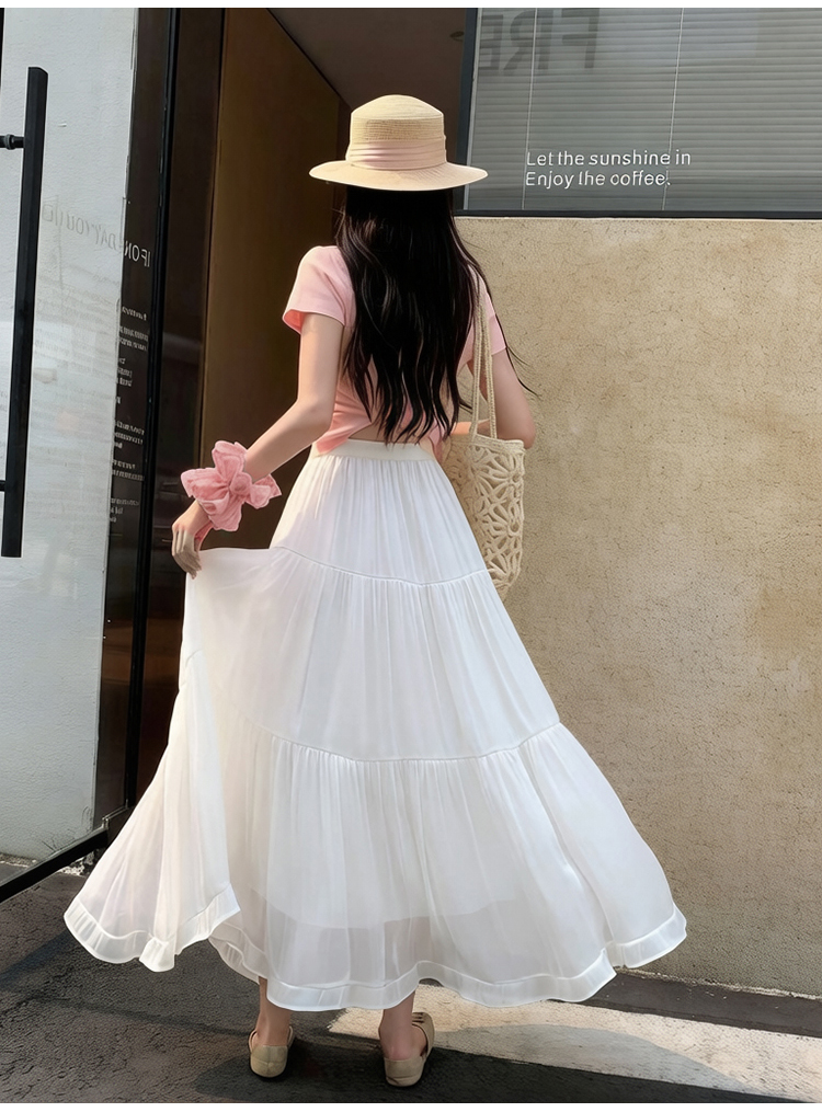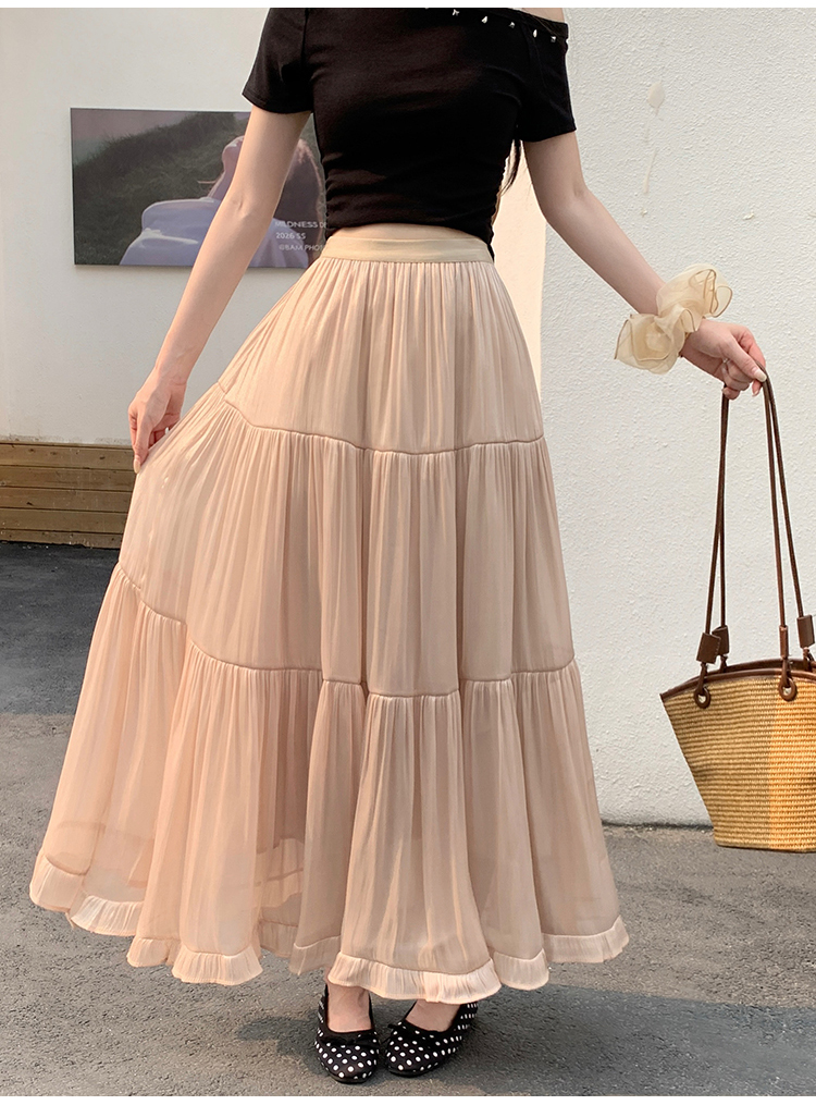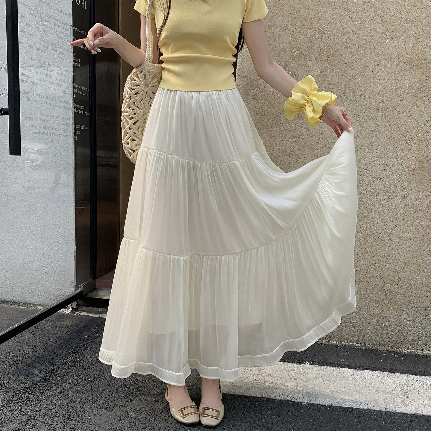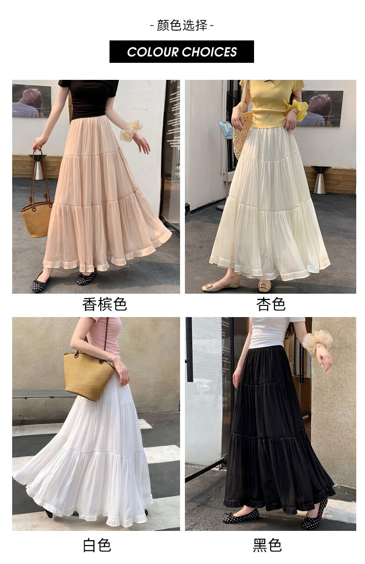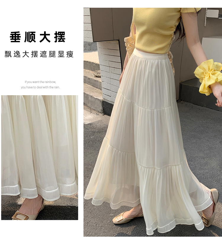 디자인 센스 화이트 롱 스커트 허리밴드 도루 가을 쉬폰 반신 스커트 프릴 측면 단색 불규칙 롱 스커트