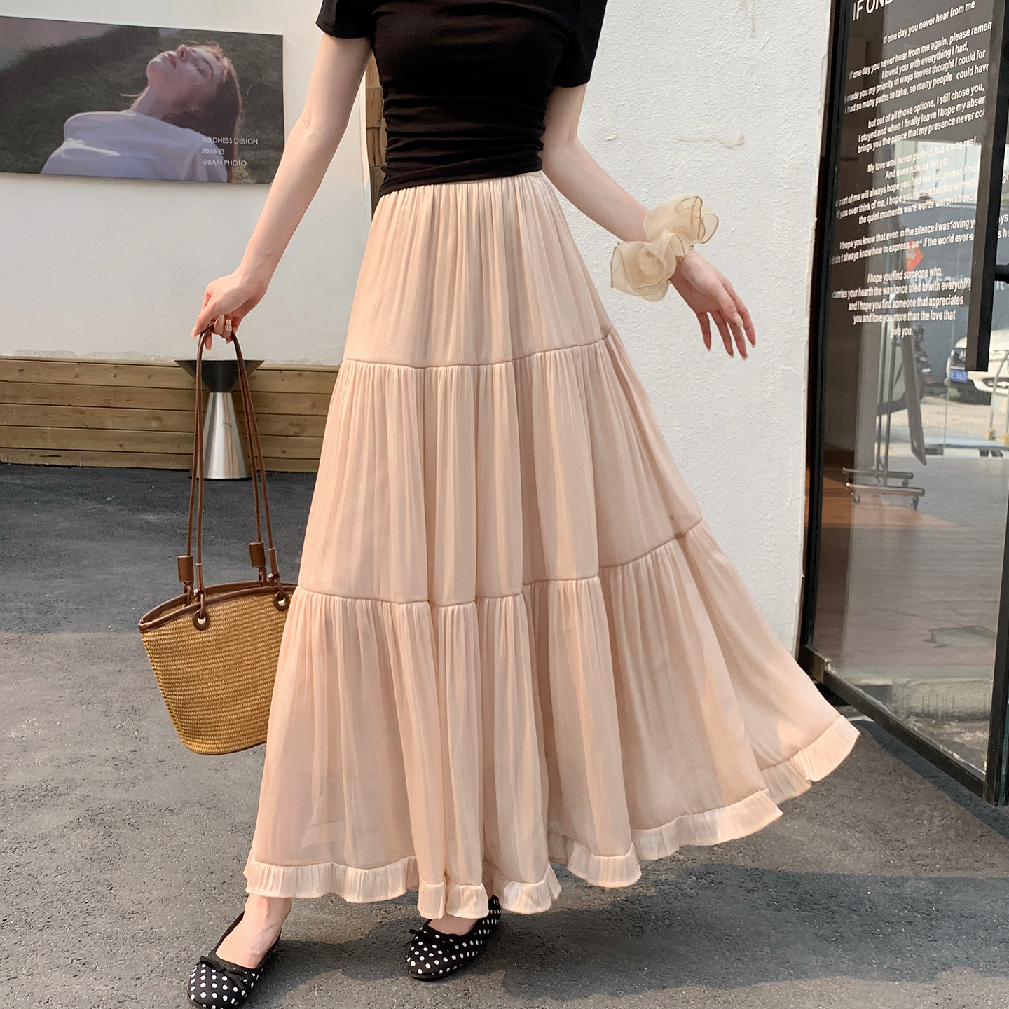 프랑스식 불규칙 체크무늬 핑크색 반신 스커트 여성 여름 하이웨이스트 프릴 쉬폰 한 마디 롱 스커트