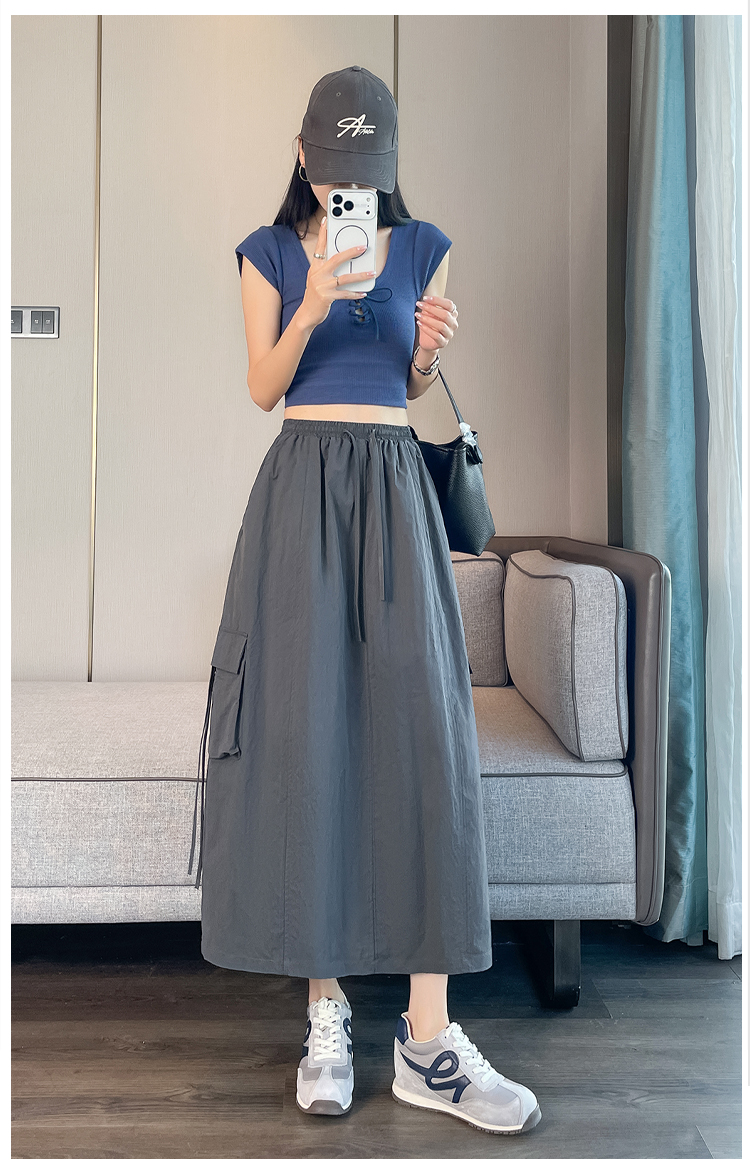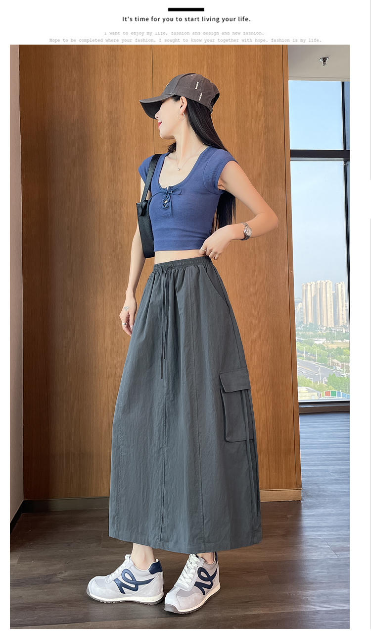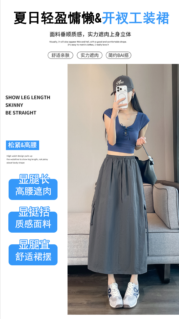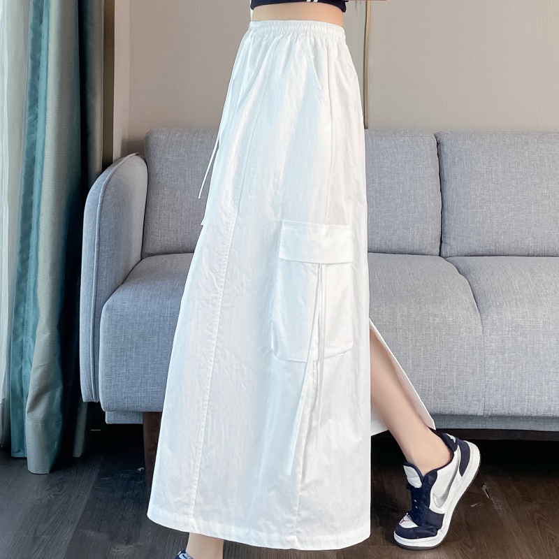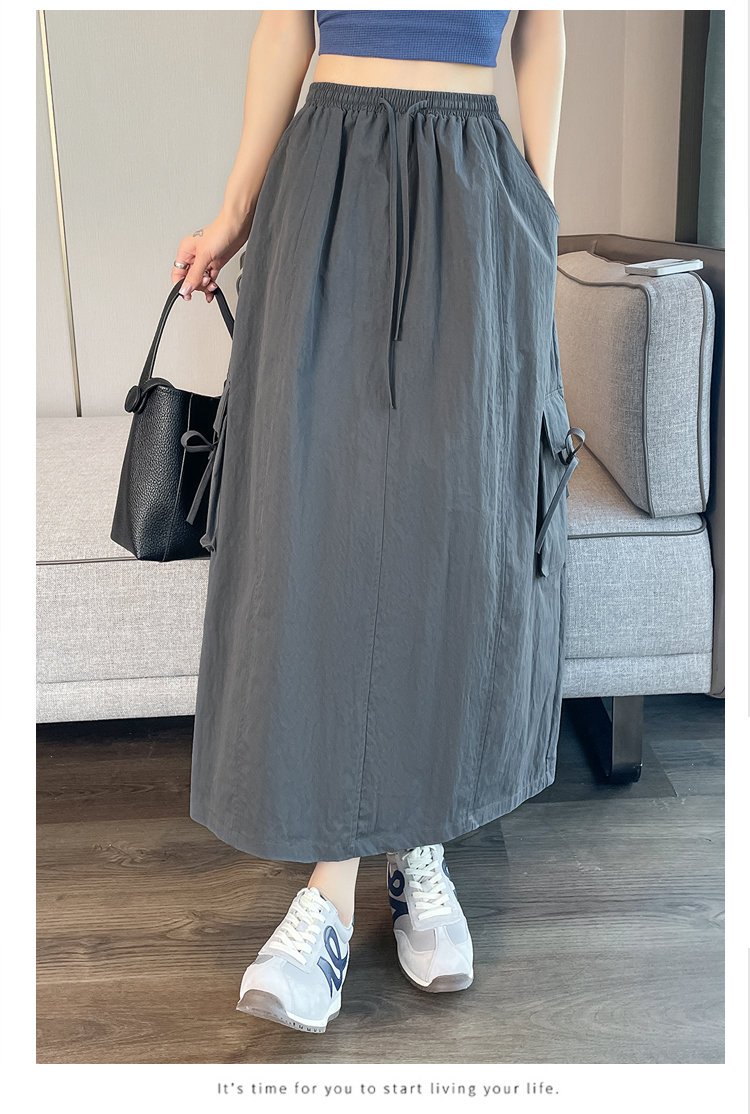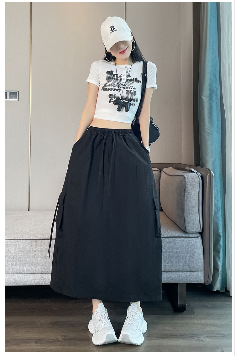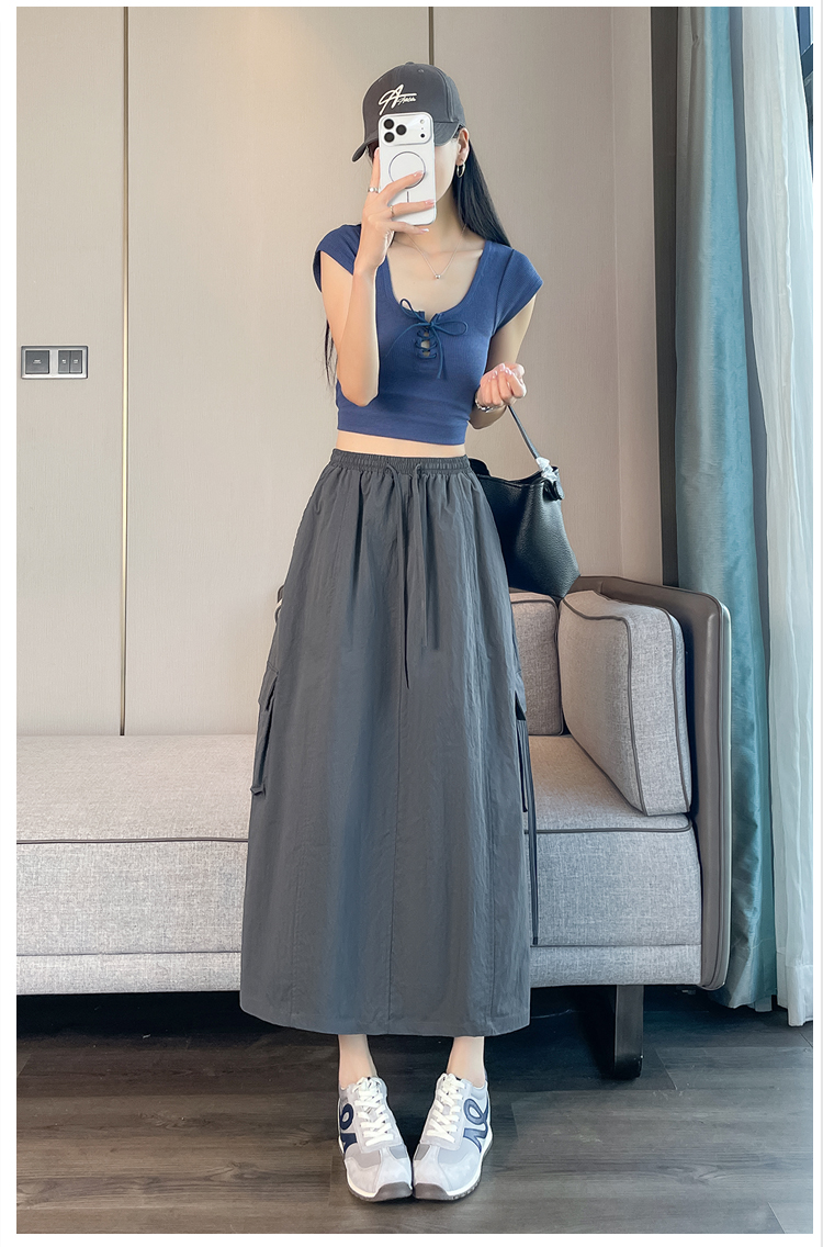 실사 여름 새로운 펌프 로프 워크웨어 주머니 캐주얼 반신 스커트 하이웨이스트 슬림해 보이는 트임 표지 십자가 다용도 A라인 스커트