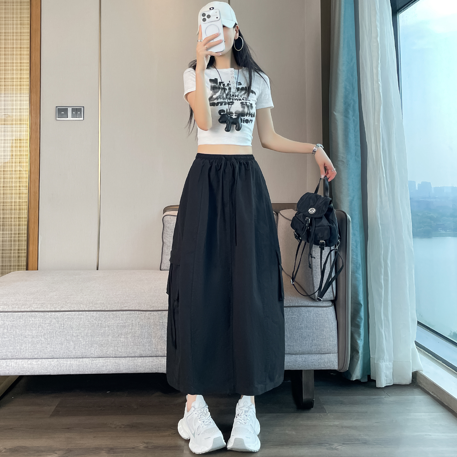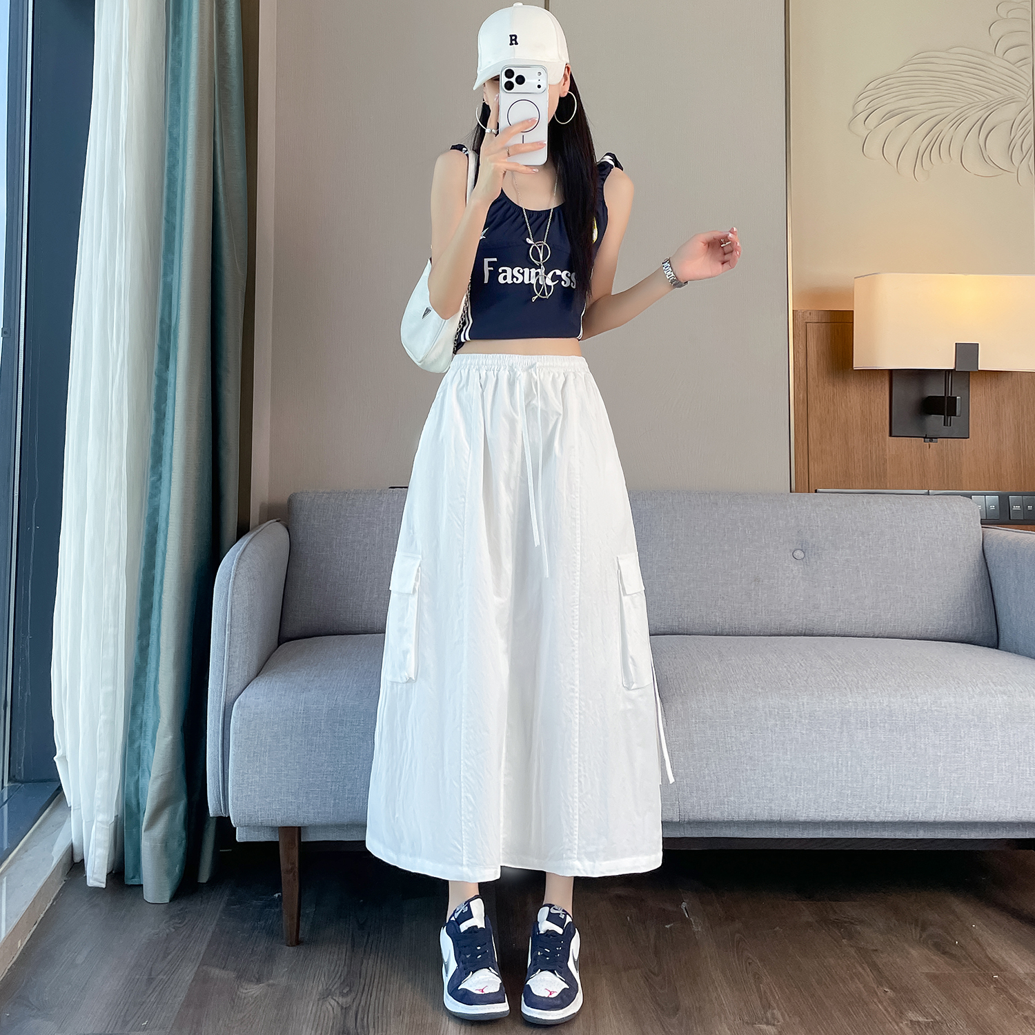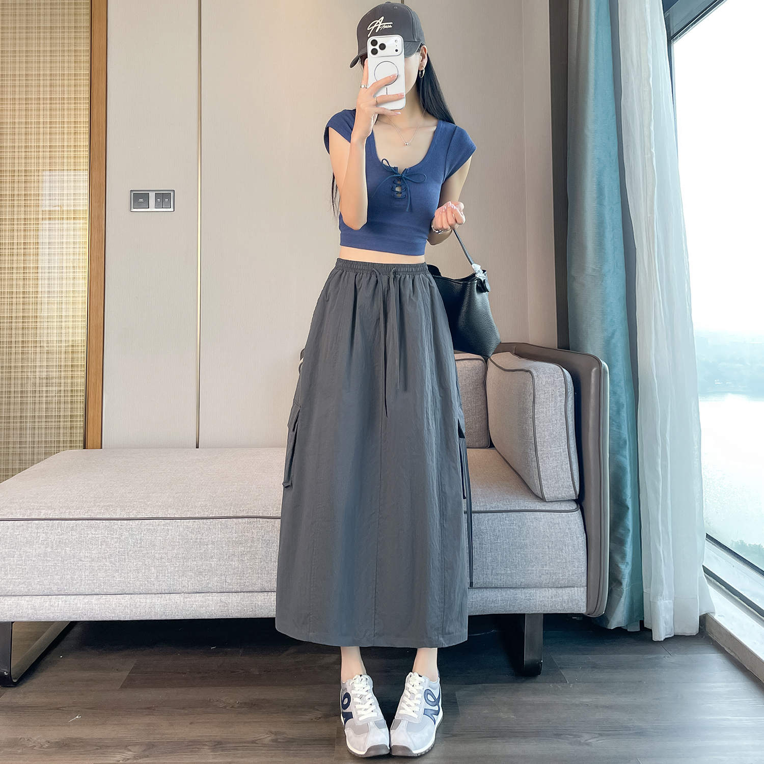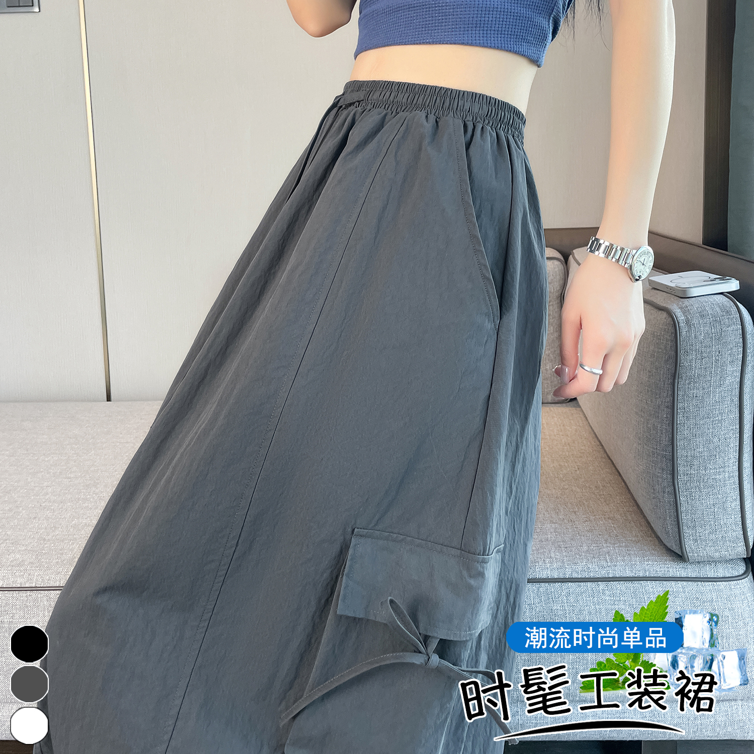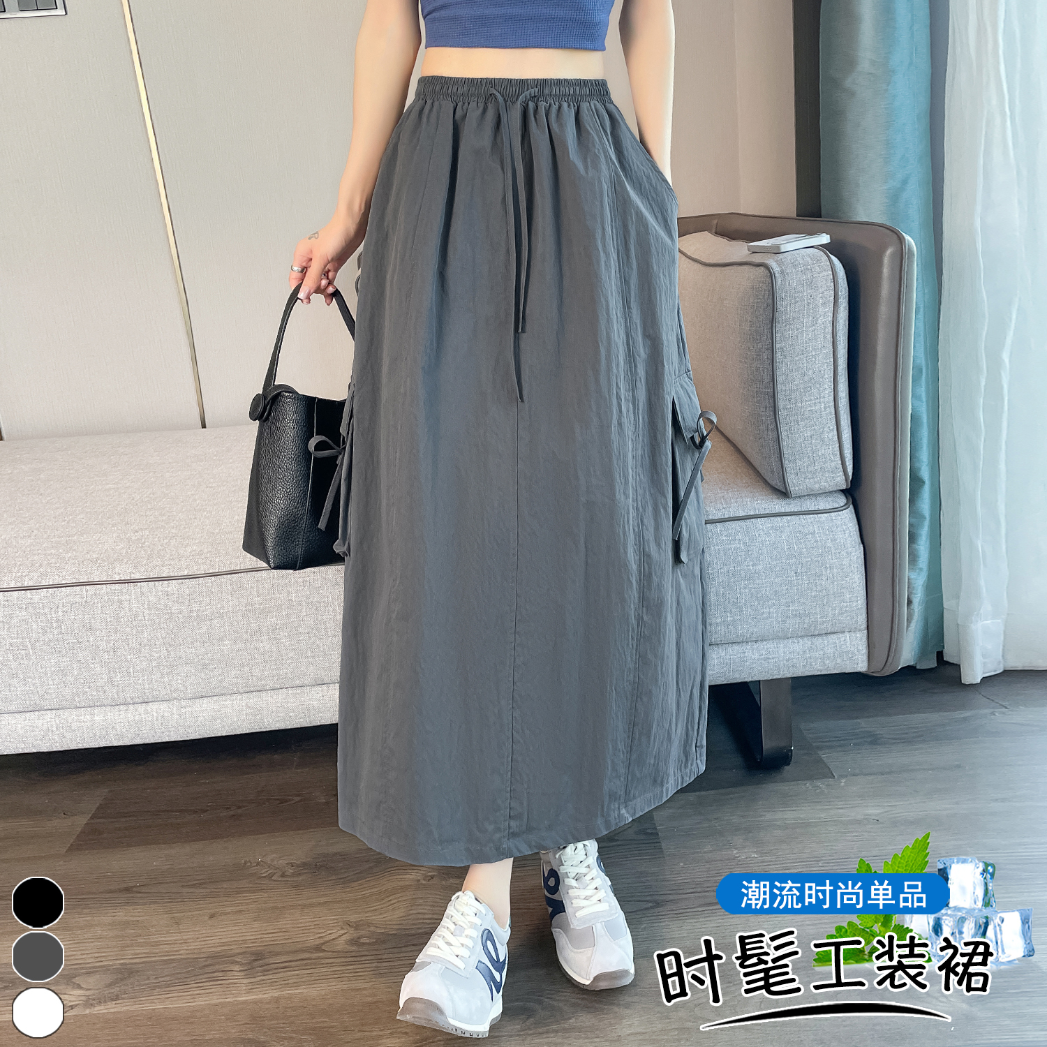 실사 여름 새로운 펌프 로프 워크웨어 주머니 캐주얼 반신 스커트 하이웨이스트 슬림해 보이는 트임 표지 십자가 다용도 A라인 스커트