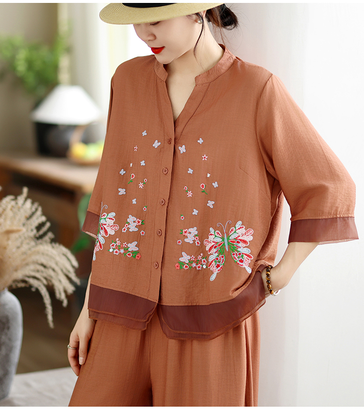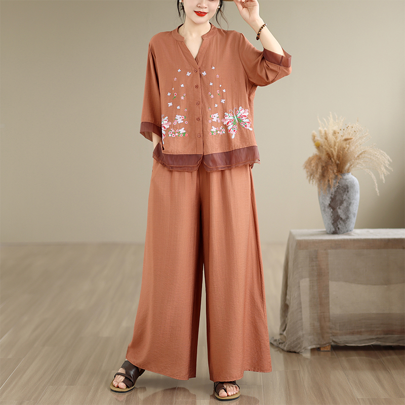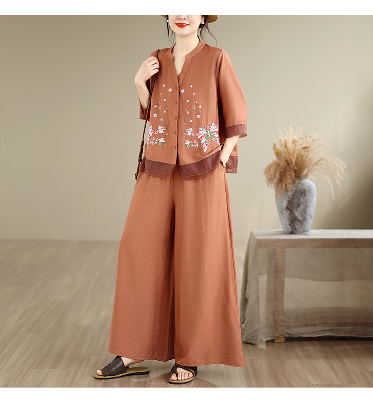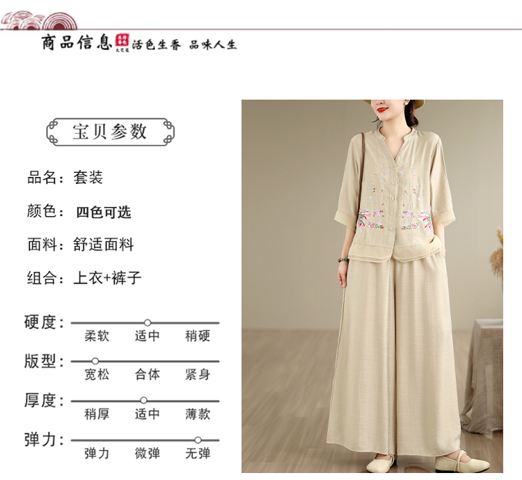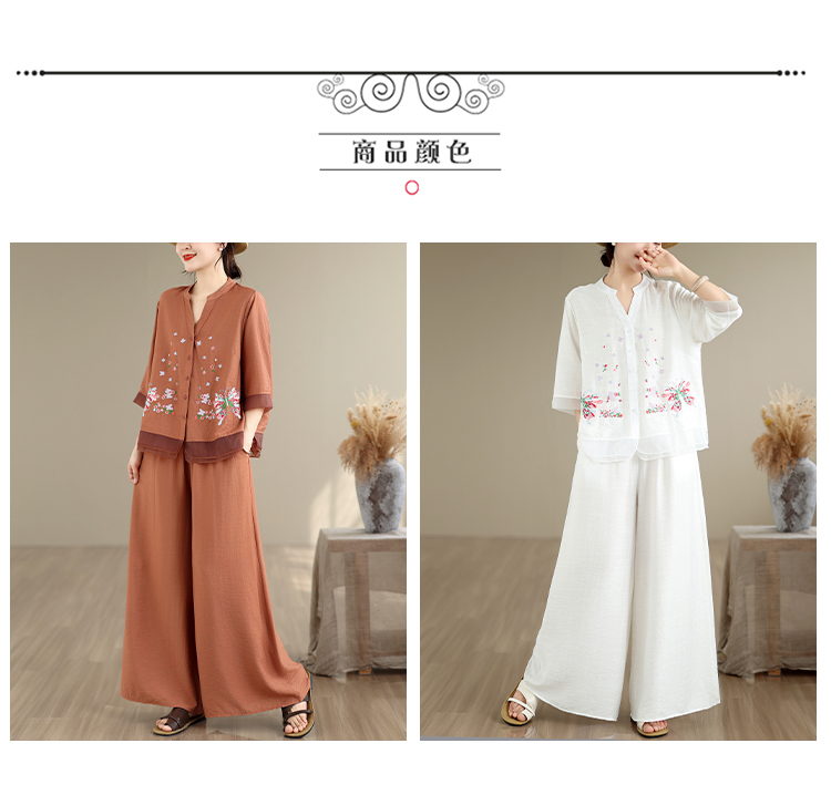 실사 2026 년 레트로 라미 작은 스탠드 칼라 자수 맨위 프린트 넓은 다리 길이 바지 투피스 세트