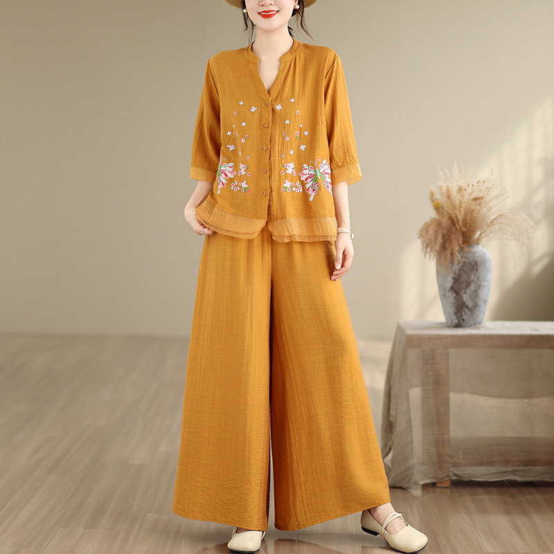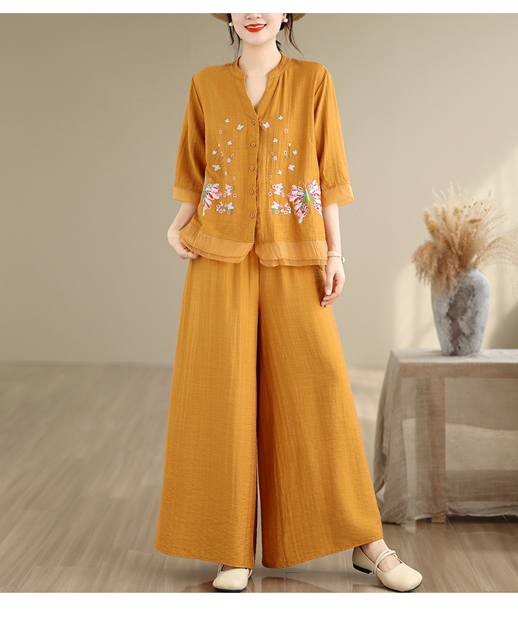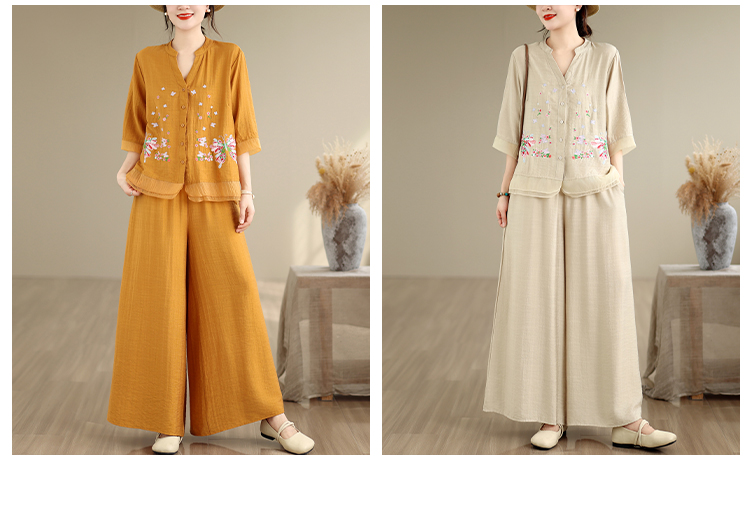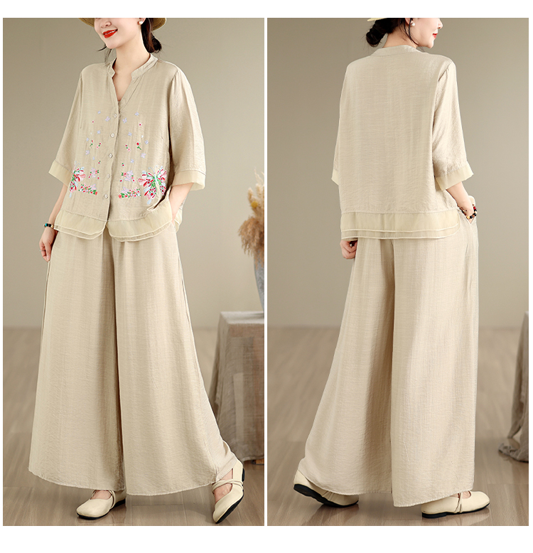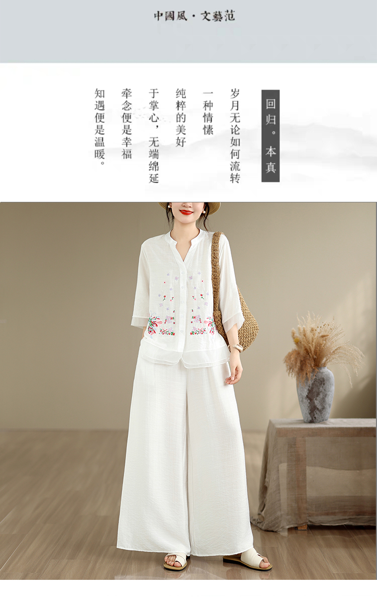 실사 2026 년 여름 새로운 레트로 문예 아마 자수 맨위 넓은 다리 길이 바지 투피스 세트