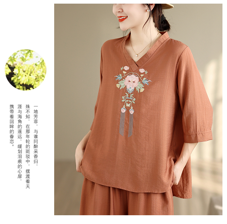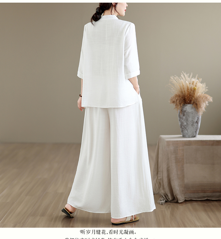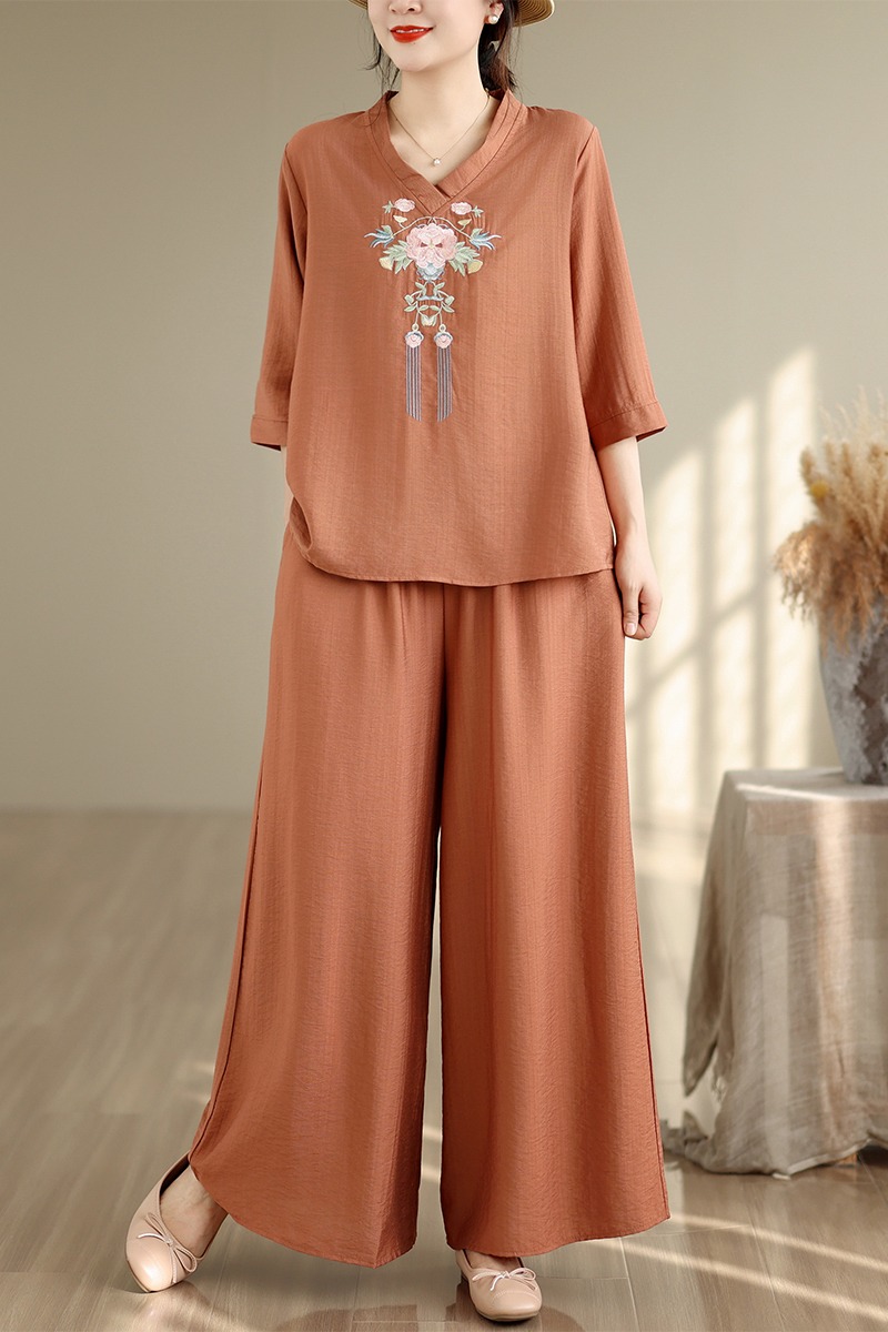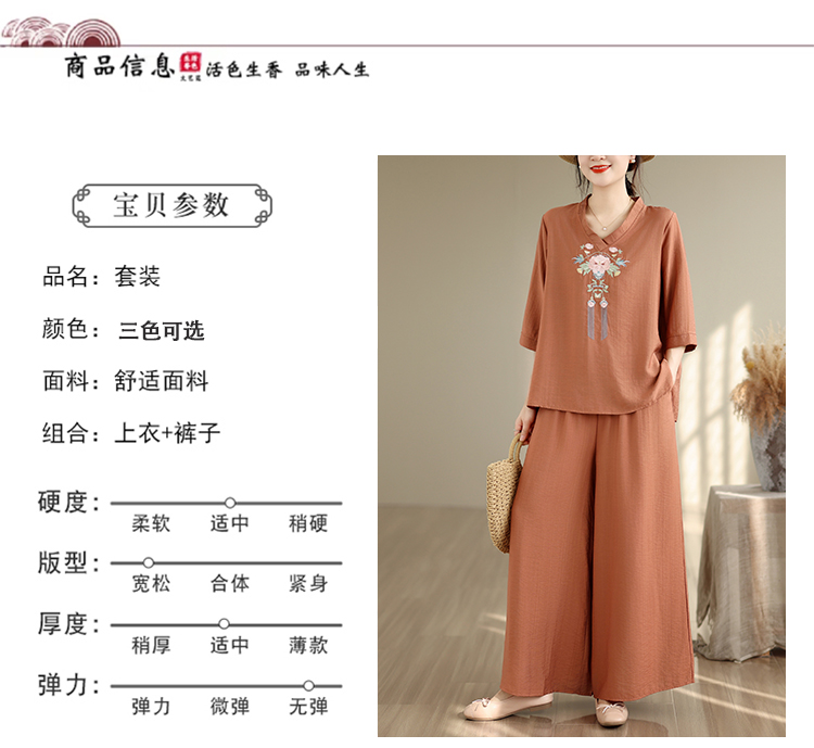 실사 2026 년 레트로 라미 작은 스탠드 칼라 자수 맨위 프린트 넓은 다리 길이 바지 투피스 세트