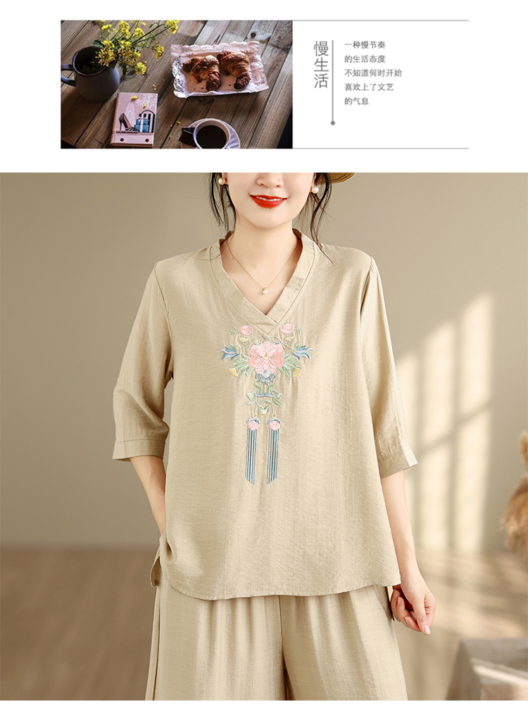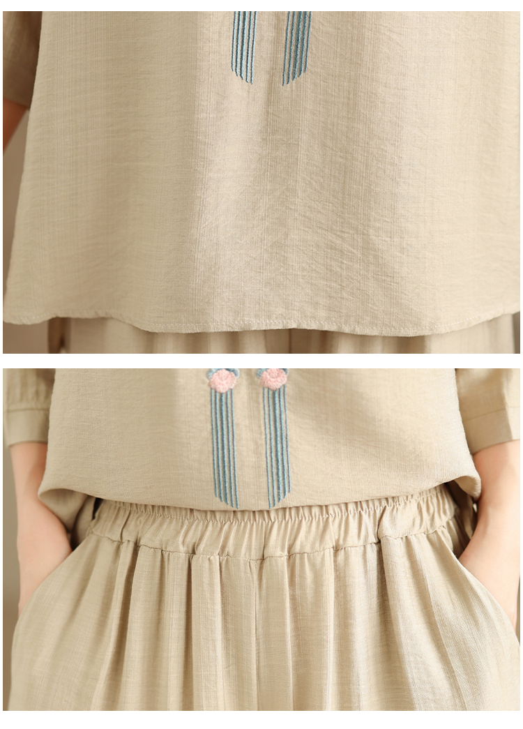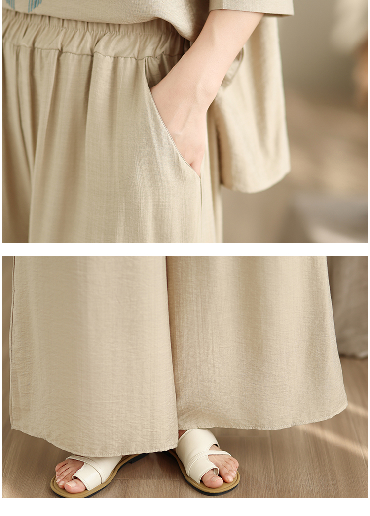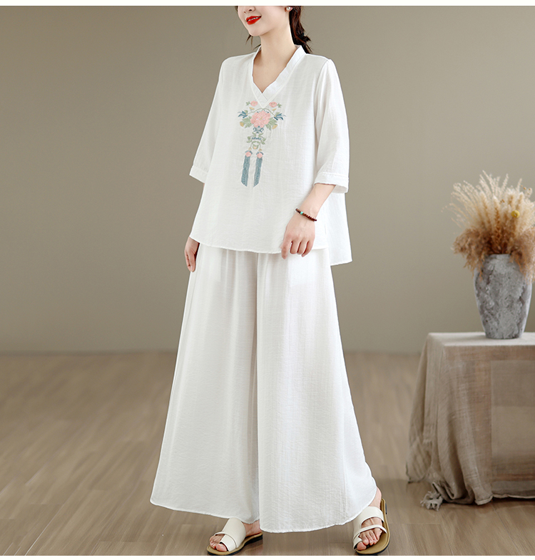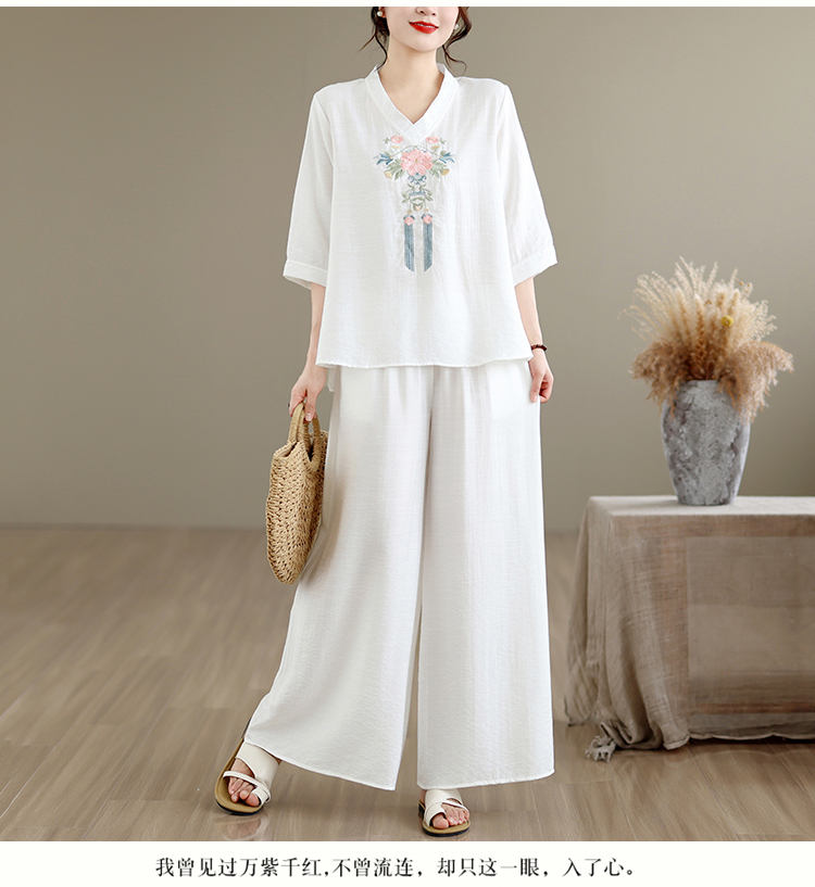 실사 2026 년 여름 새로운 레트로 문예 아마 자수 맨위 넓은 다리 길이 바지 투피스 세트