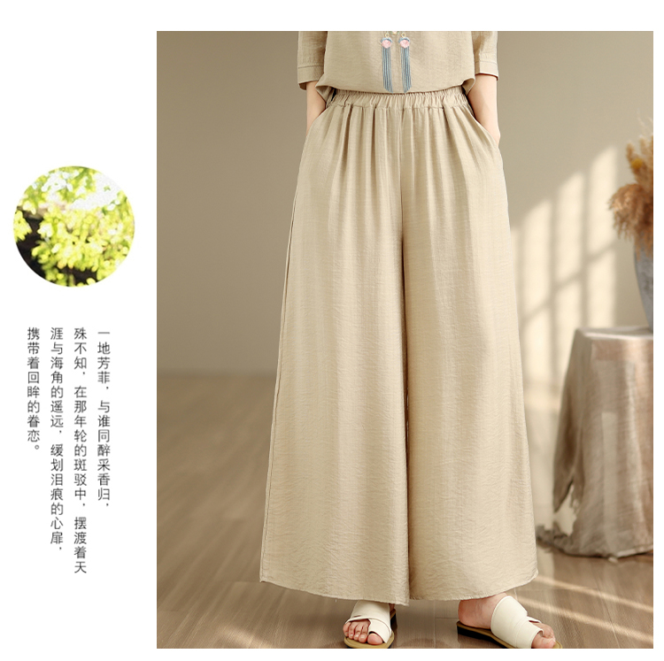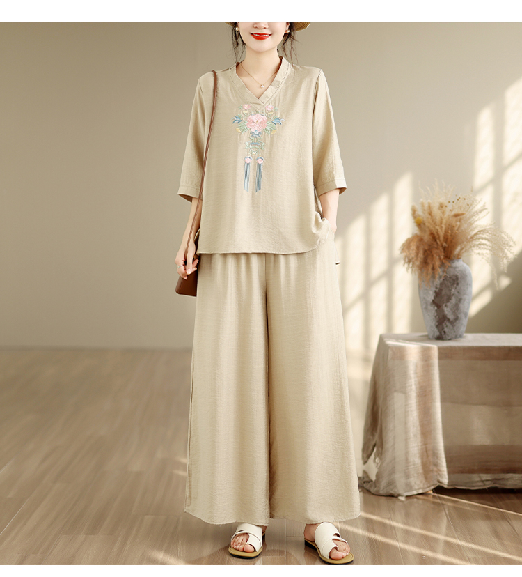 실사 2026 년 단색 자수 라미 문예 맨위 캐주얼 슬림해 보이는 넓은 다리 길이 바지 투피스 세트