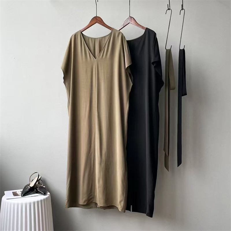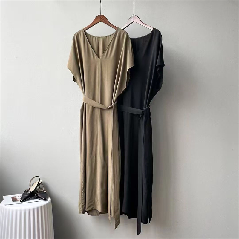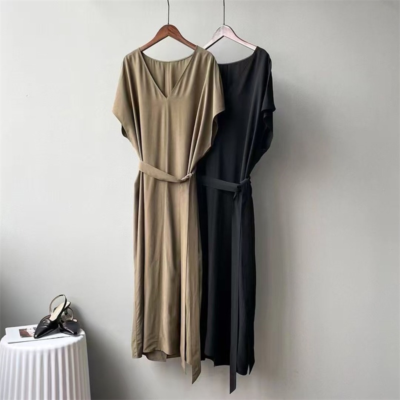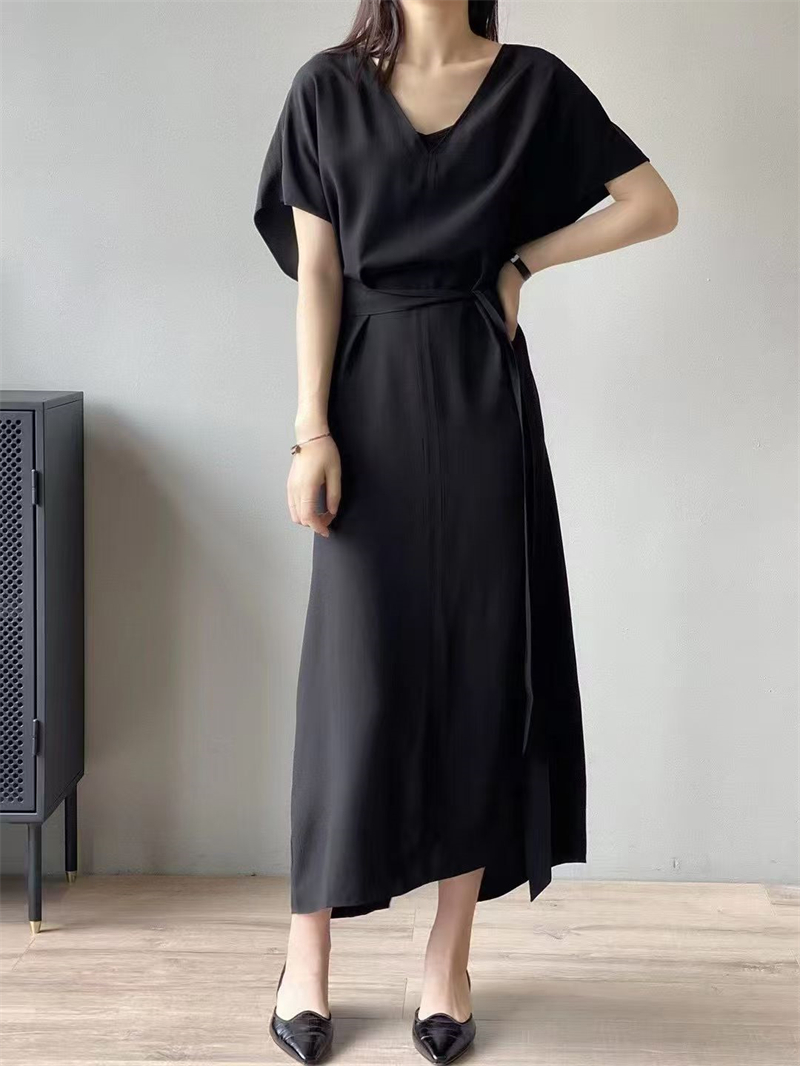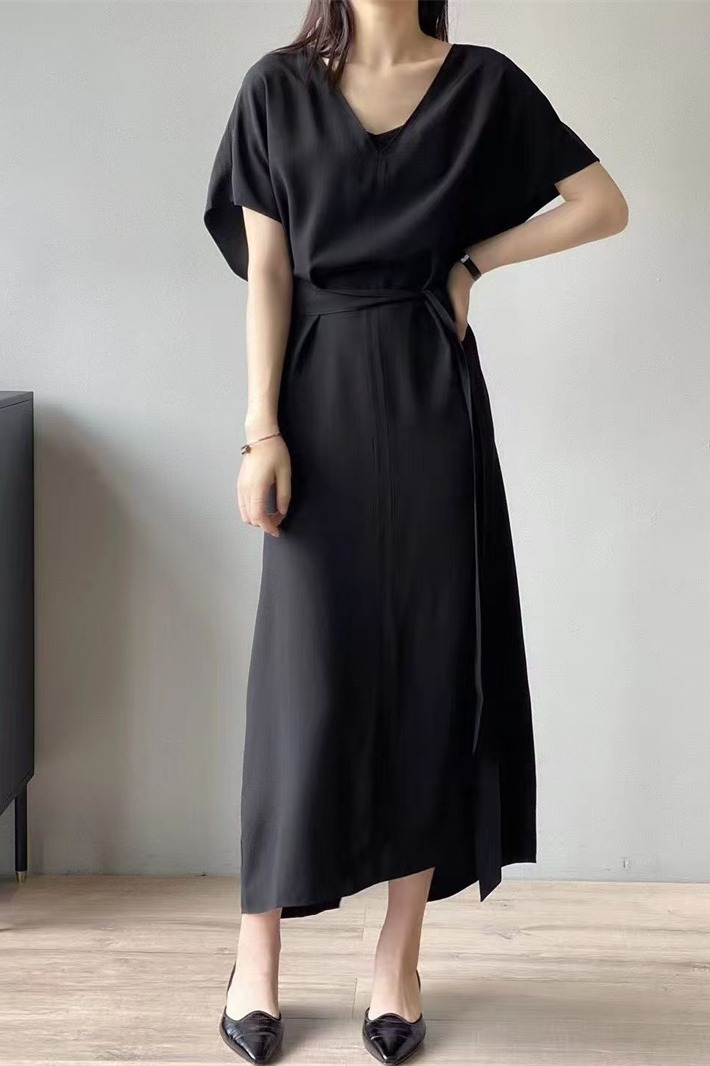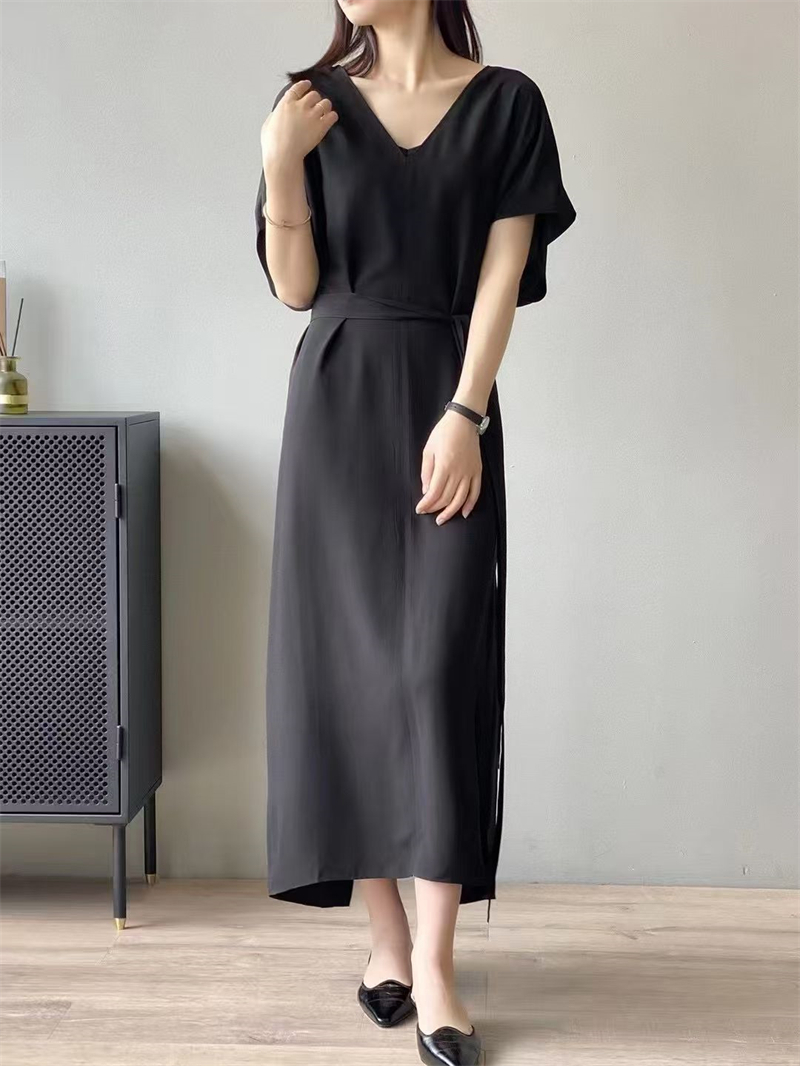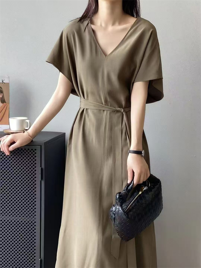 실사 프랑스식 여름 새로운 미니멀리즘 출퇴근 V넥 캐주얼 다용도 펌프 로프 허리 수축 디자인 슬림해 보이는 여성 드레스