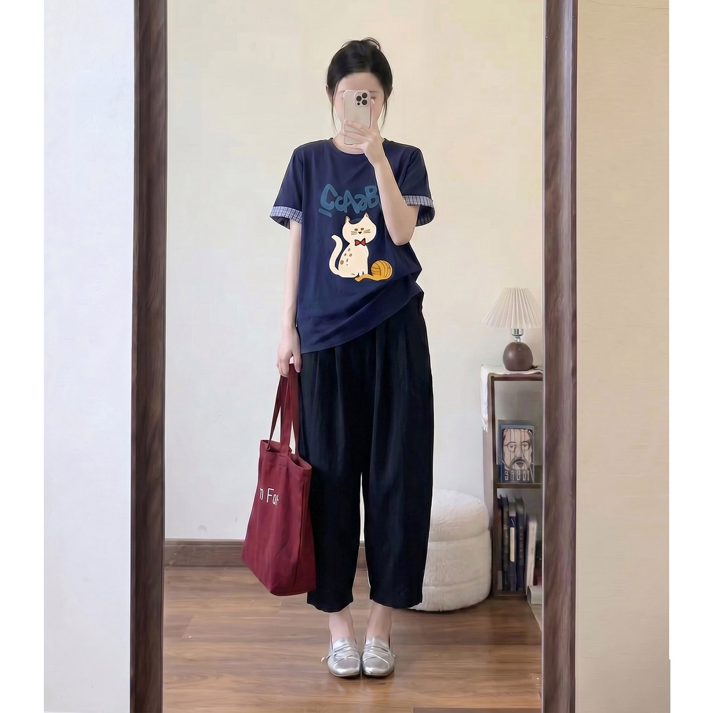 임산부 세트 여름 외출용 얇은 스타일 루즈핏 중간 길이 빅 사이즈 맨위 티셔츠
