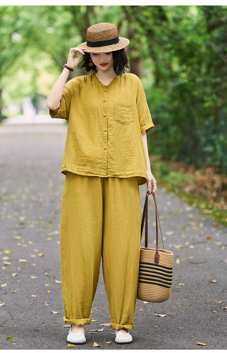 100 자연 순수 린넨 셔츠 V넥 자연 우아한 긴팔 셔츠 황색 자외선 차단 여성 셔츠 재킷 이른 봄