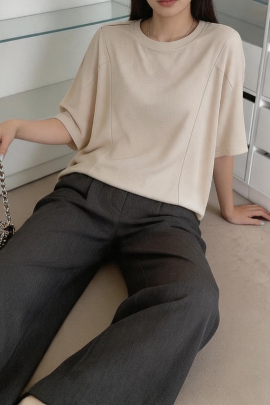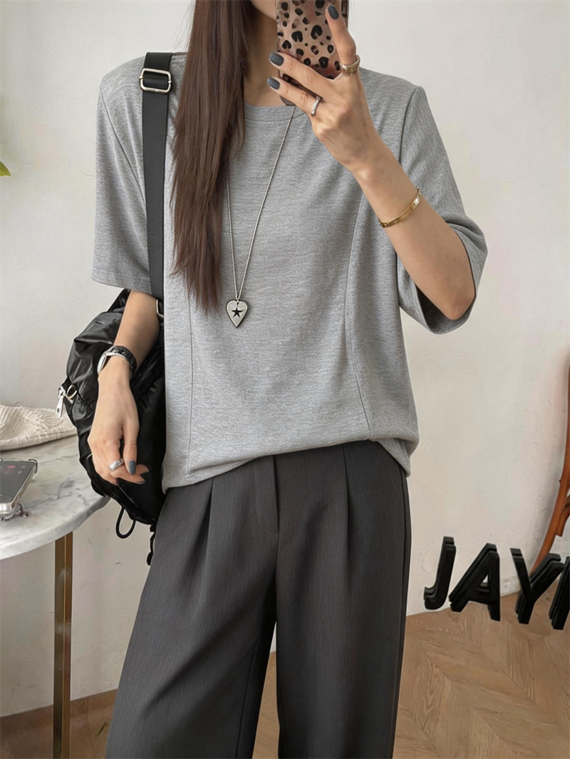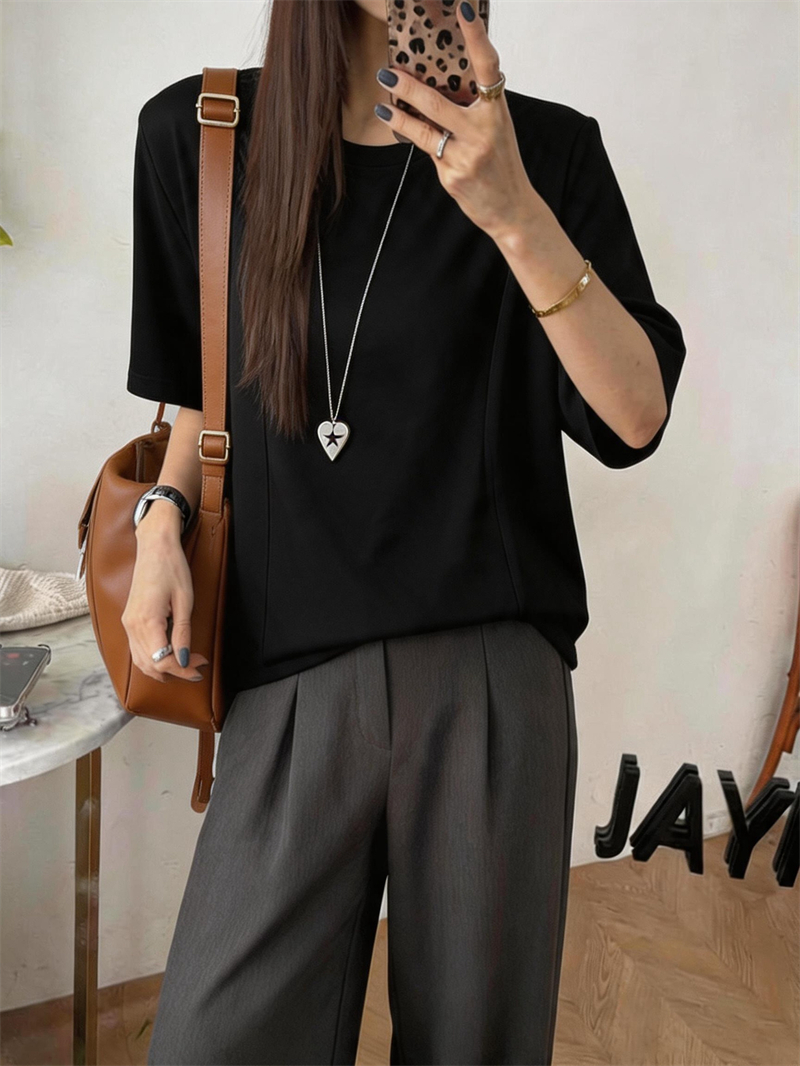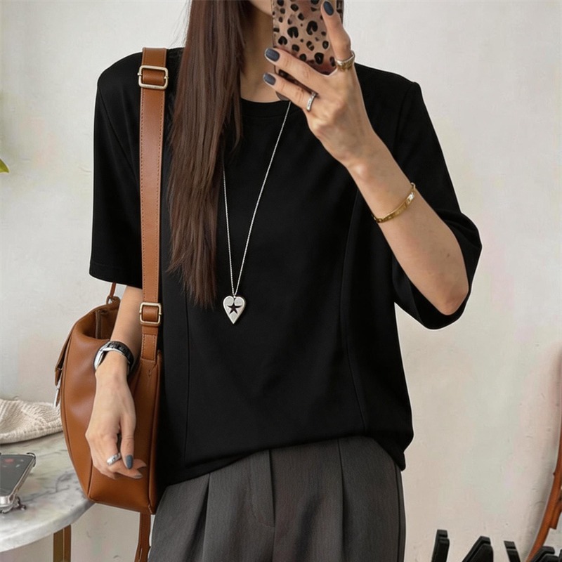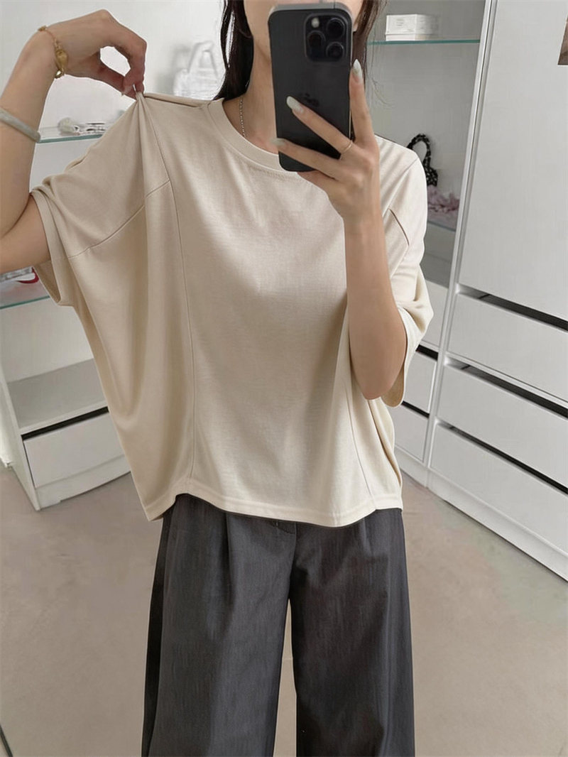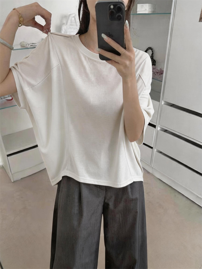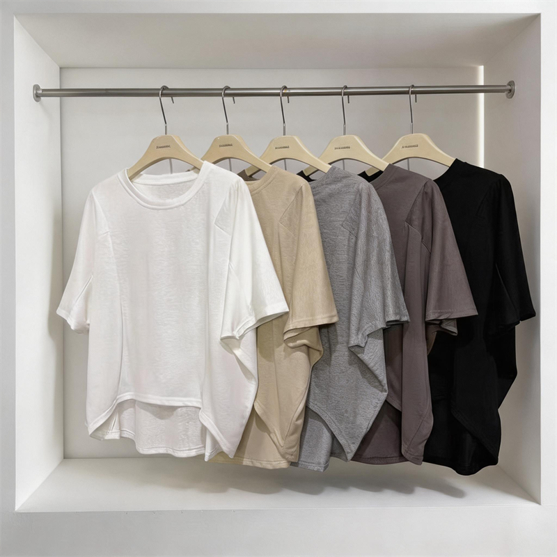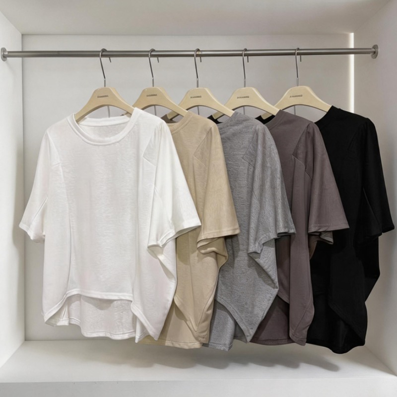 실사 여름 새로운 미니멀리즘 패션 다용도 디자인 패치워크 밑단 라운드 넥 반팔 단색 루즈핏 캐주얼 티셔츠 여성