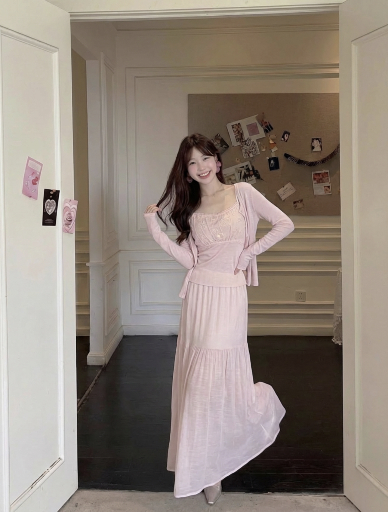 실사 정가 폭발 디자인 센스 녹색 페이크 레이어드 층 레이스 반 스커트 투피스 세트