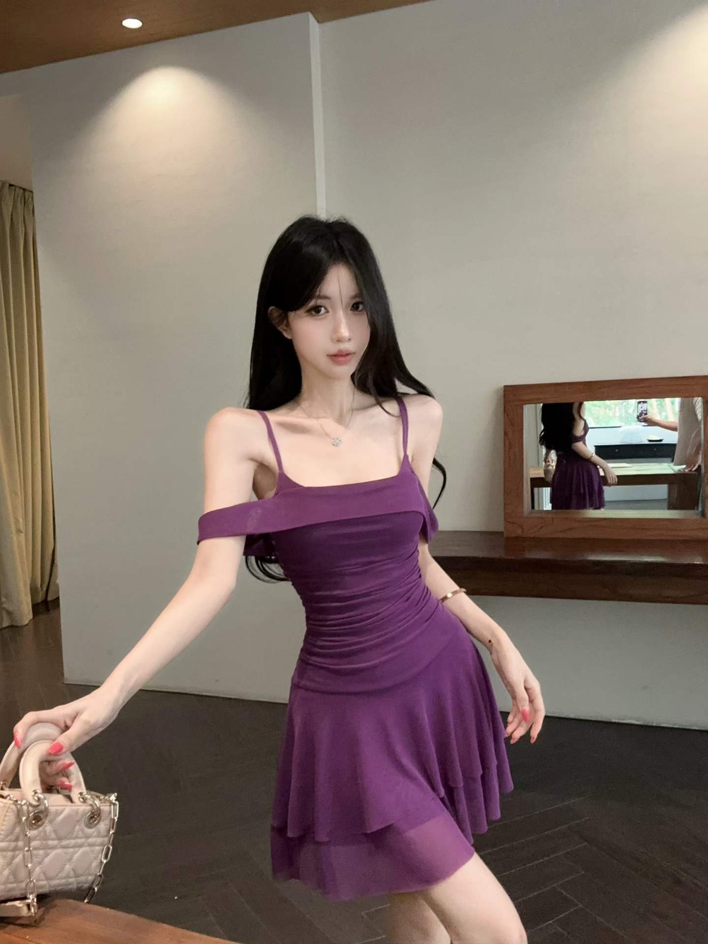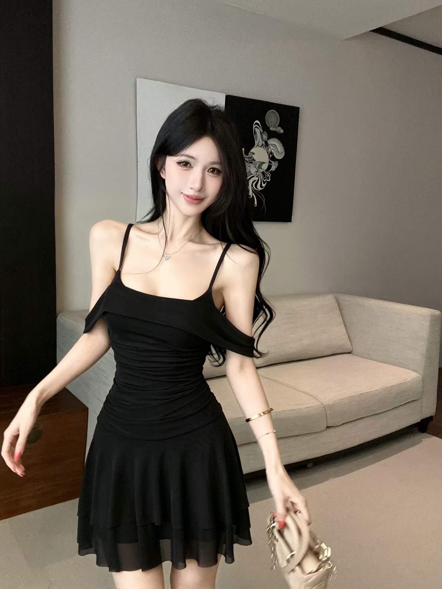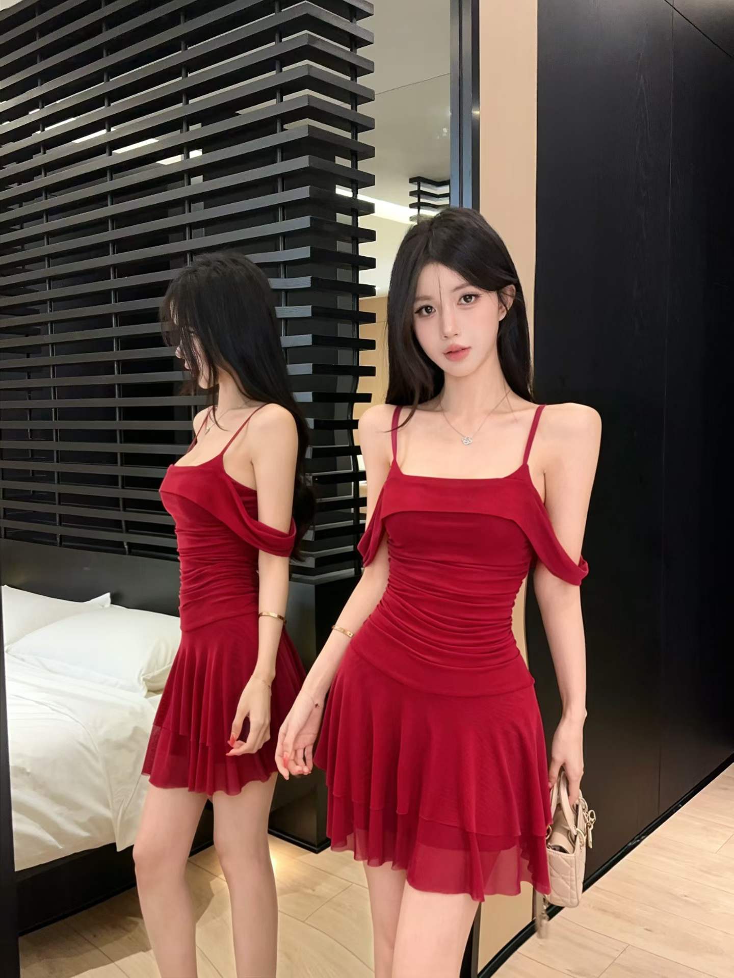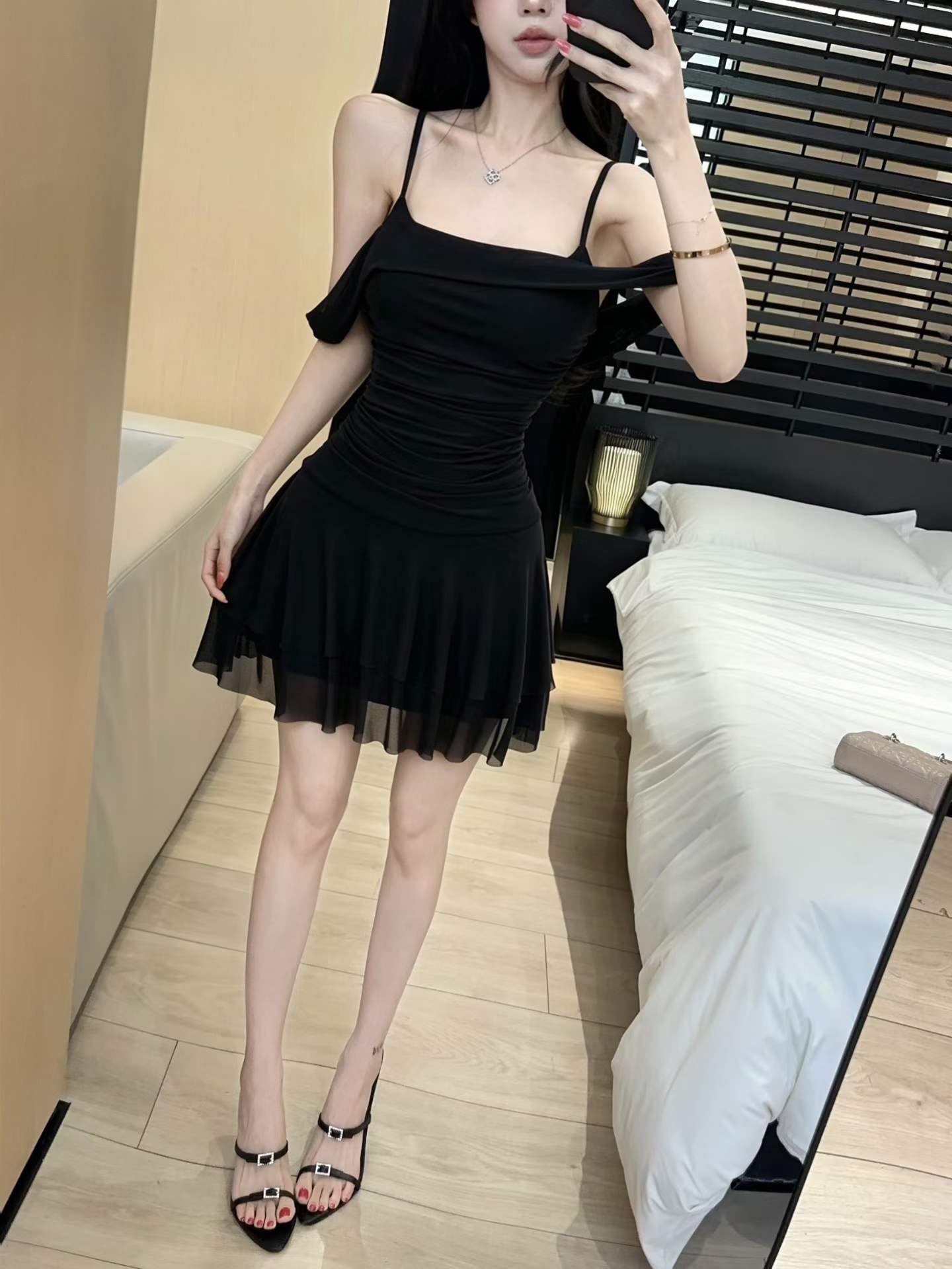 실사 프랑스식 소녀 데이트 드레스 부적 디자인 센스 보트넥 새는 어깨 사진 찍기 미니 스커트
