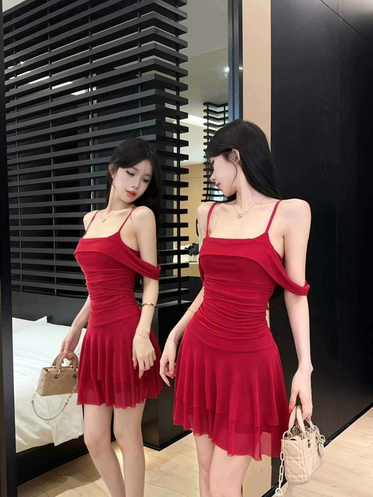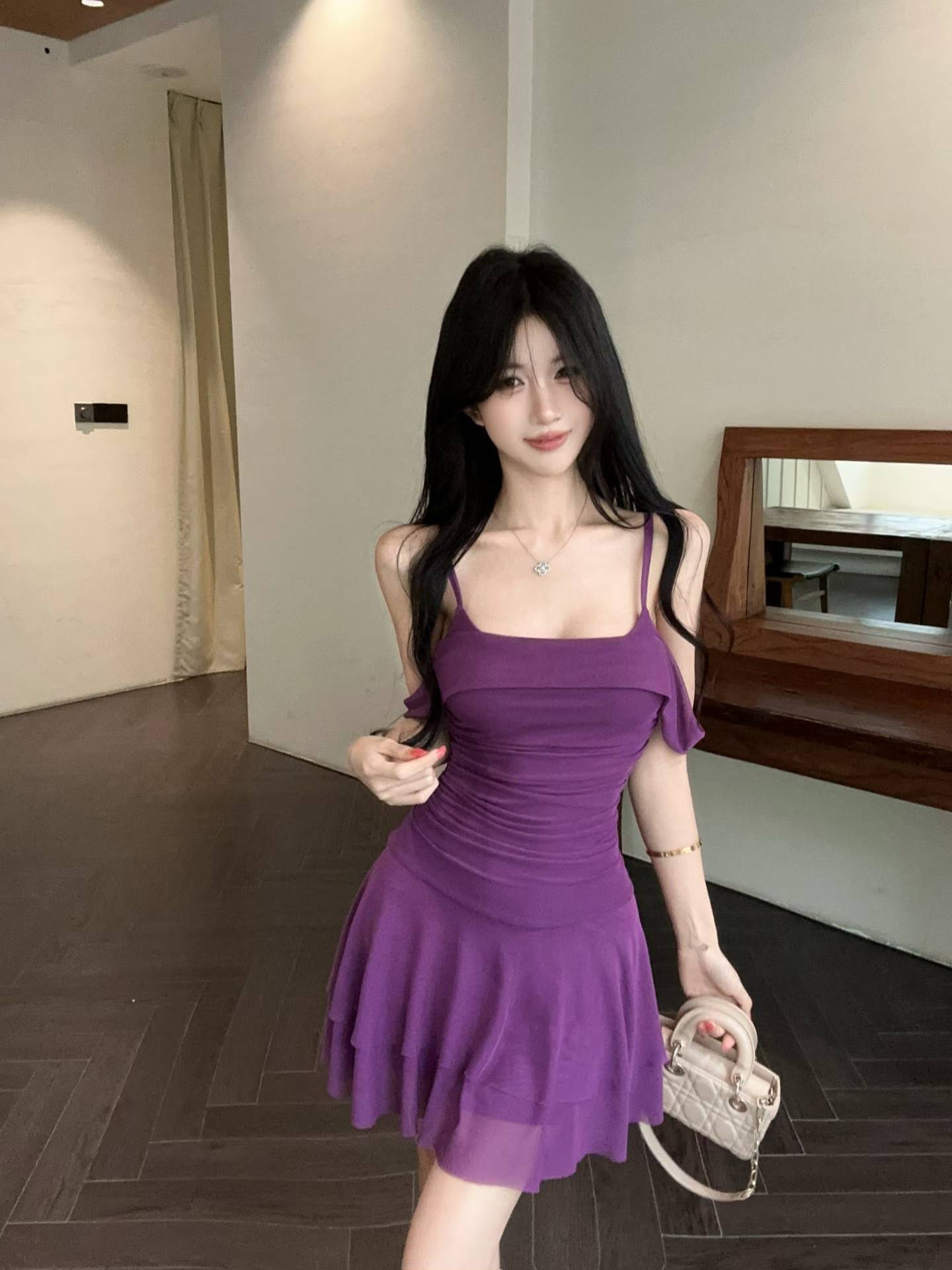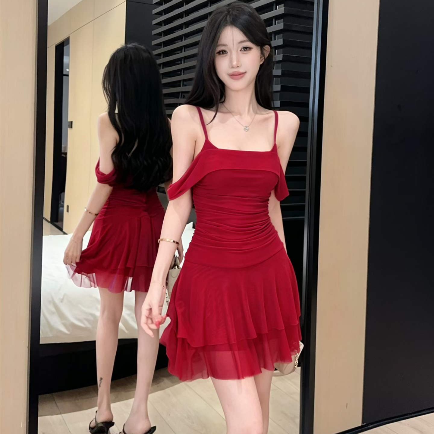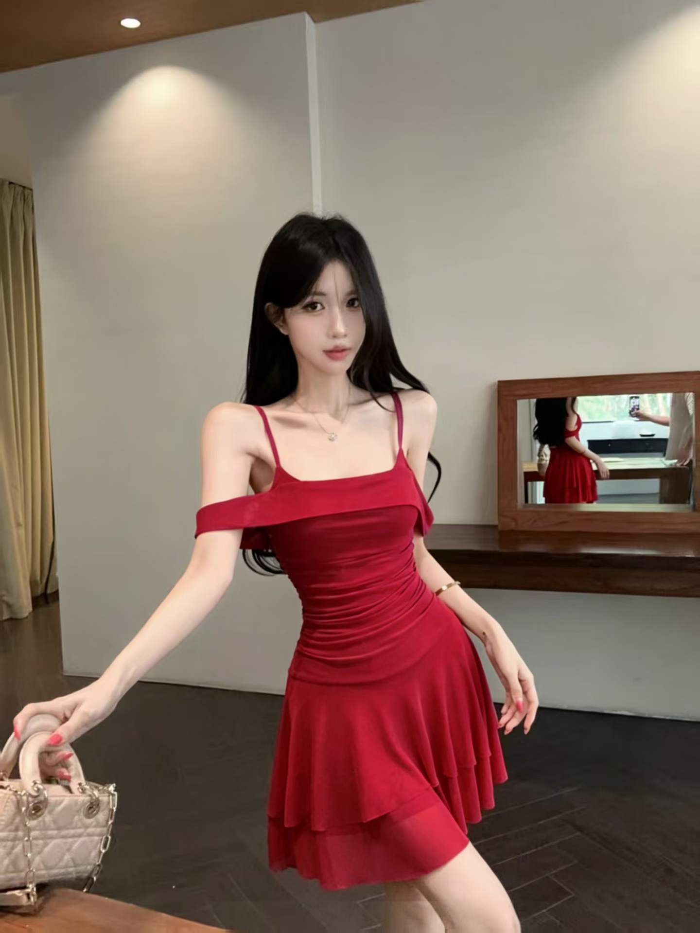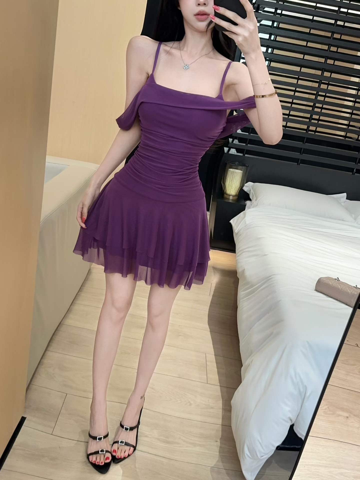 실사 프랑스식 소녀 데이트 드레스 부적 디자인 센스 보트넥 새는 어깨 사진 찍기 미니 스커트