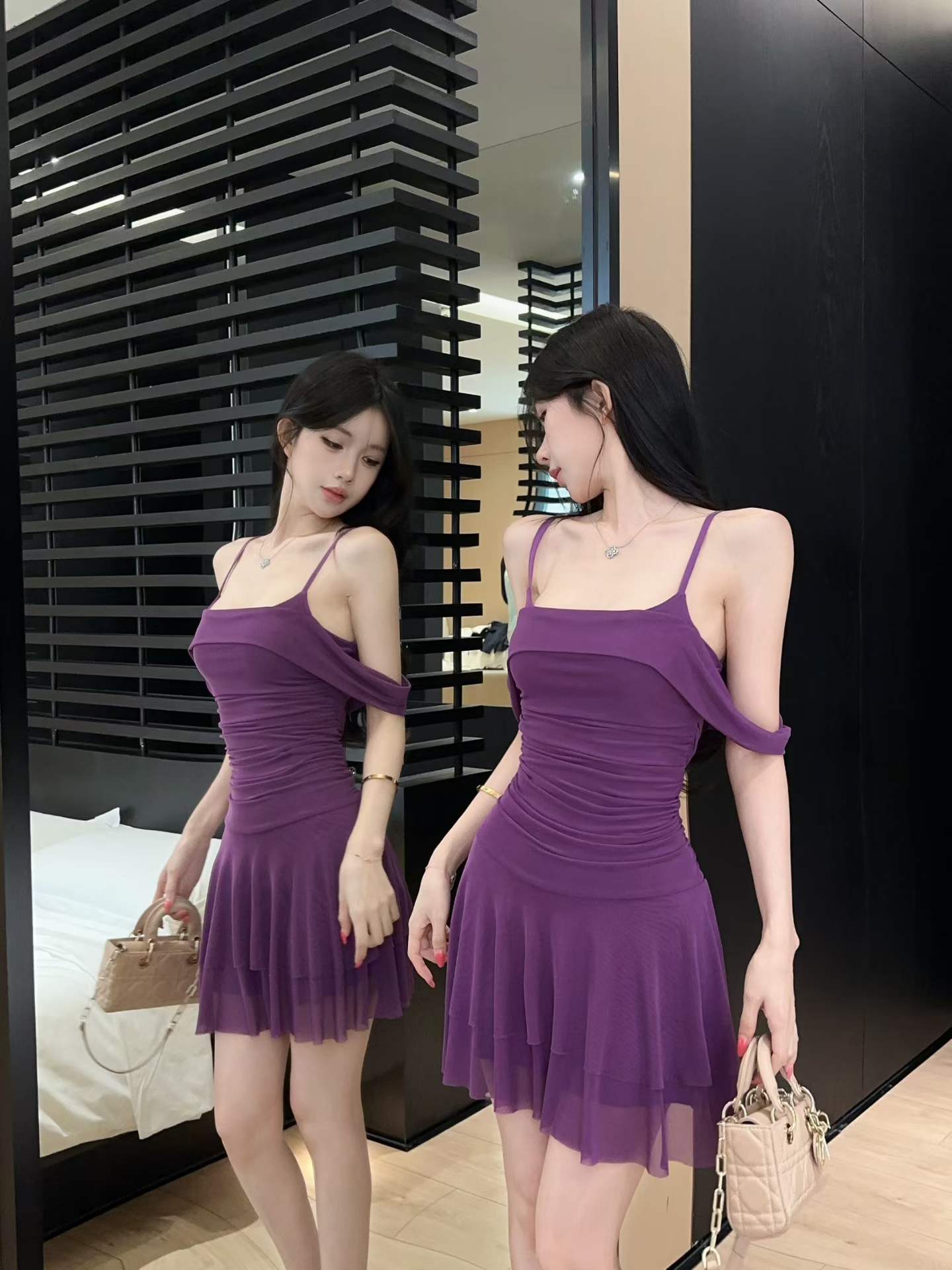 kubiliv 감기 矜 우아한 프랑스식 분위기 센스 비스듬한 어깨 비틀림 디자인 롱 스커트 섹시함 순수한 욕망 드레스