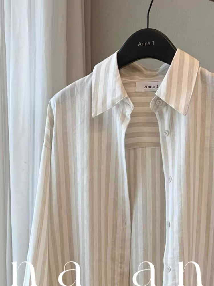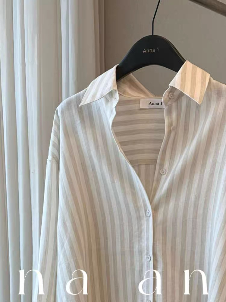 새로운 2026 여름 느슨함 센스 아마 스트라이프 POLO 칼라 여성 셔츠 봄 여름 느긋한 바람 루즈핏 자외선 차단 맨위
