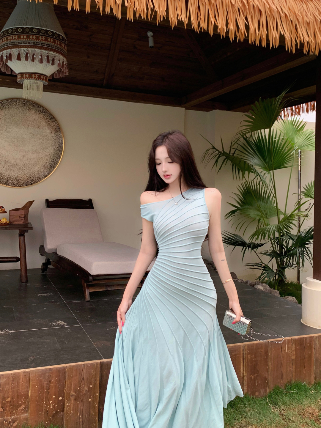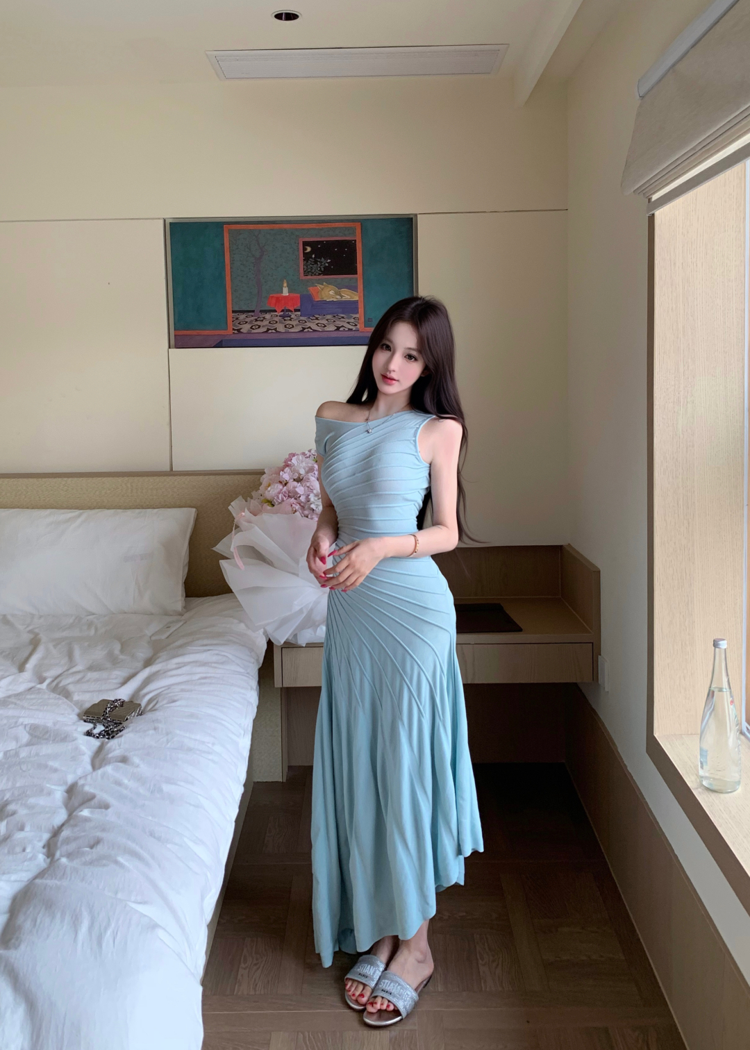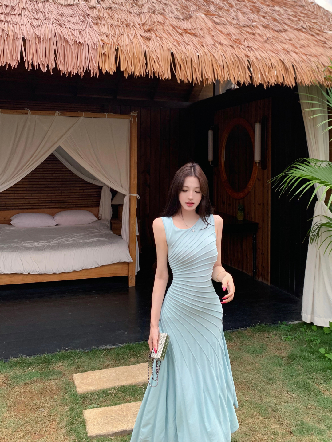 실사 정가 갤러리 봐라. 전시회 박하 녹색 드레스 니트 원피스 여성 여름 허리 수축 슬립 롱 스커트
