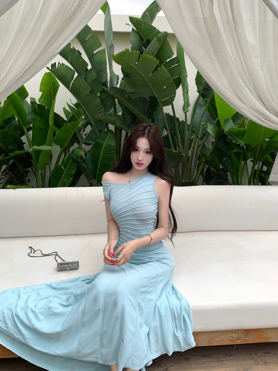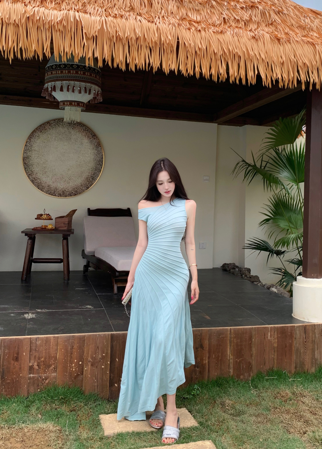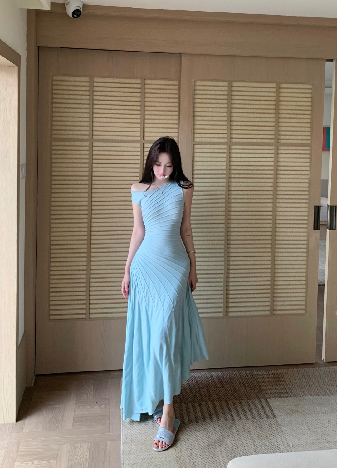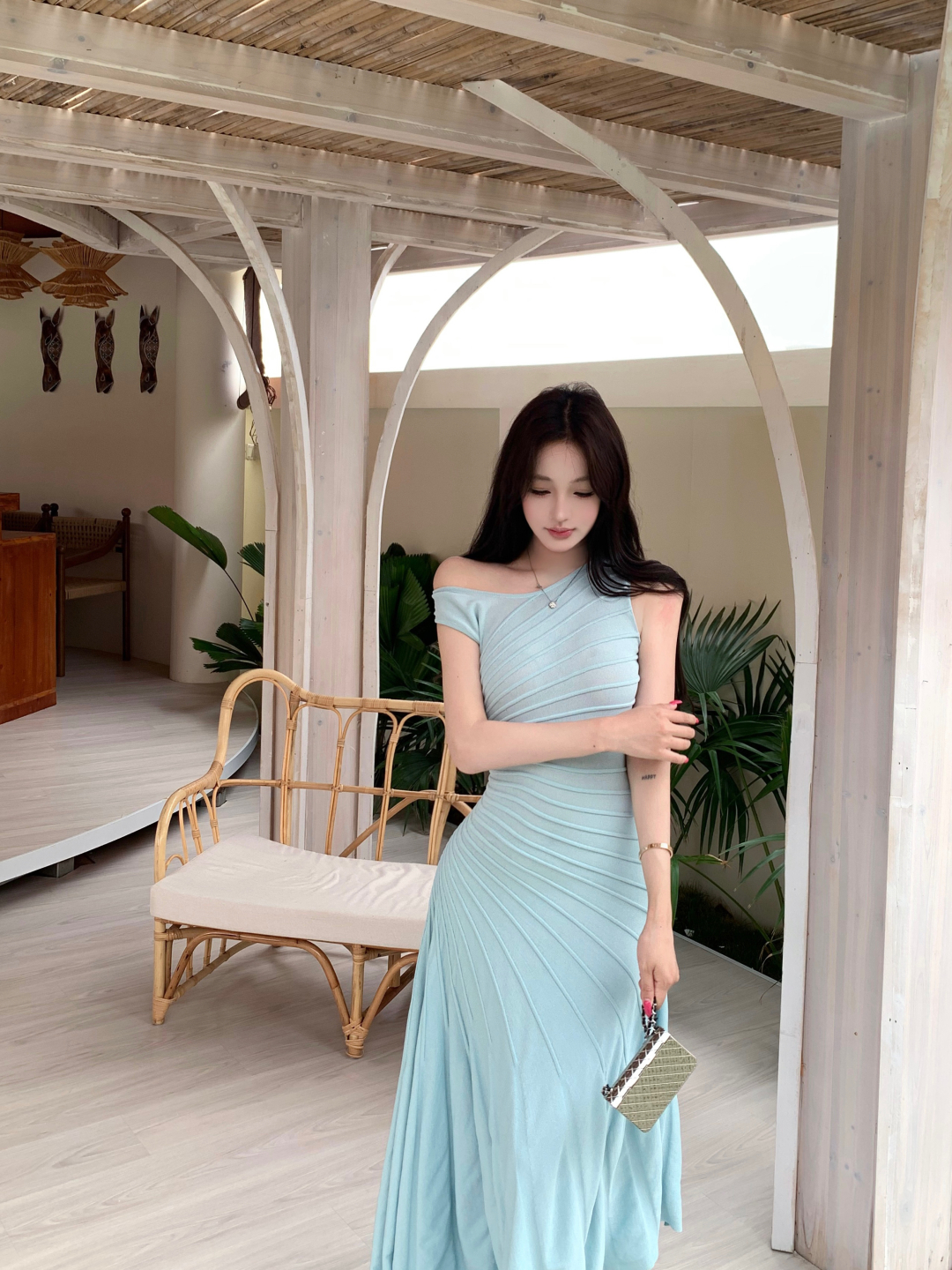 실사 정가 갤러리 봐라. 전시회 박하 녹색 드레스 니트 원피스 여성 여름 허리 수축 슬립 롱 스커트