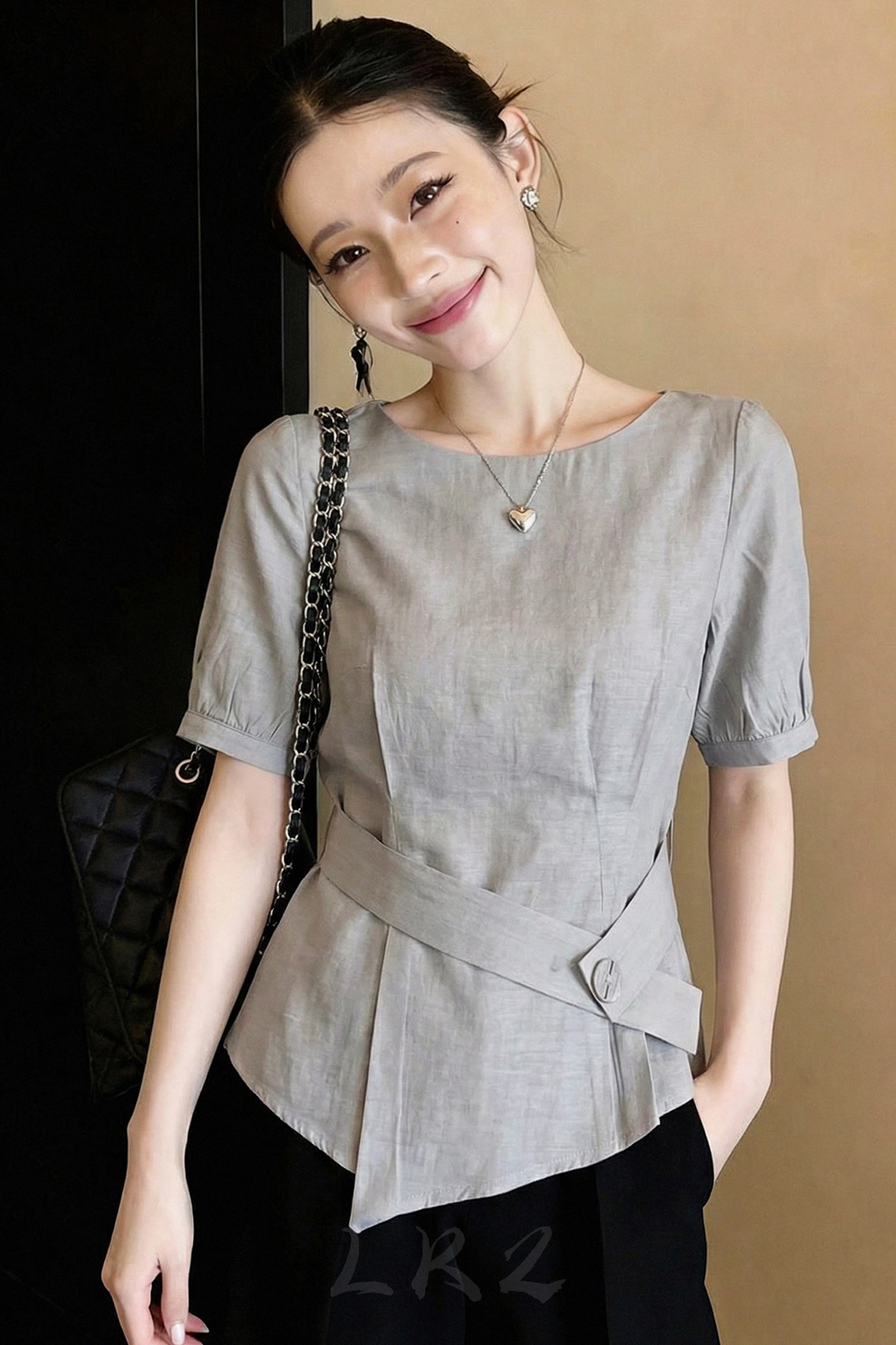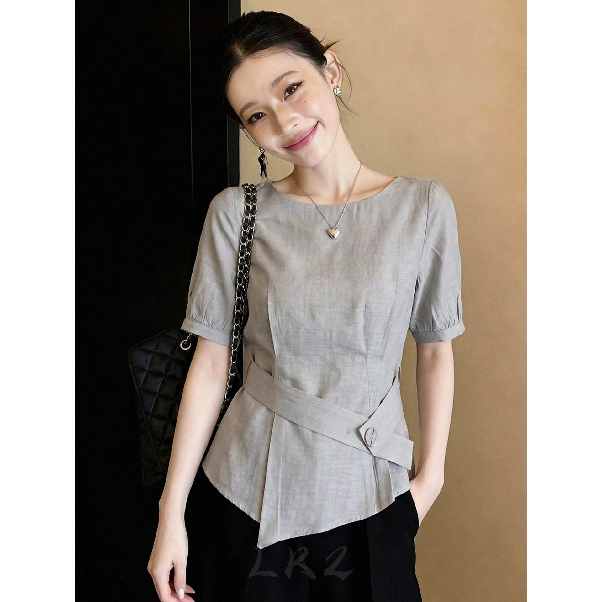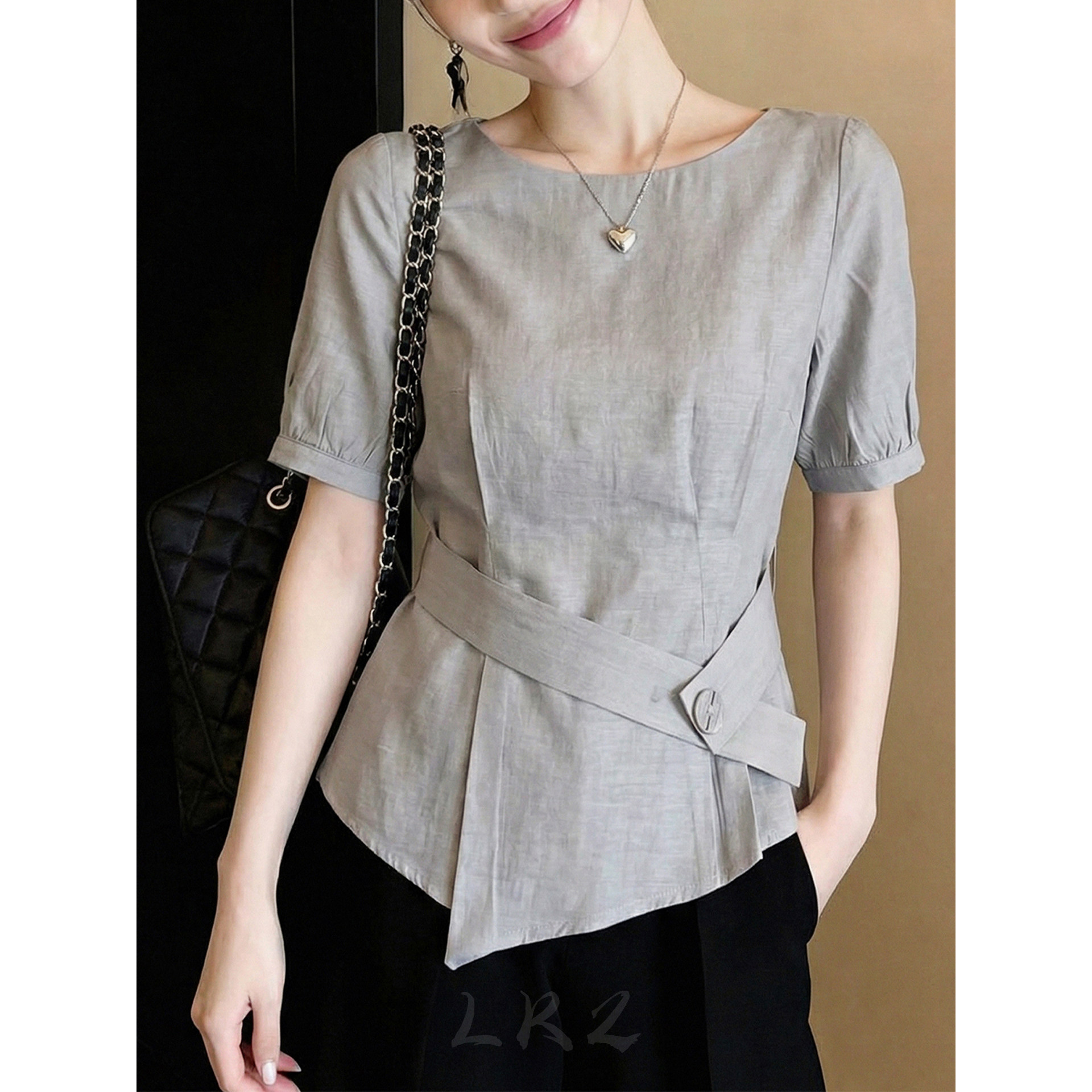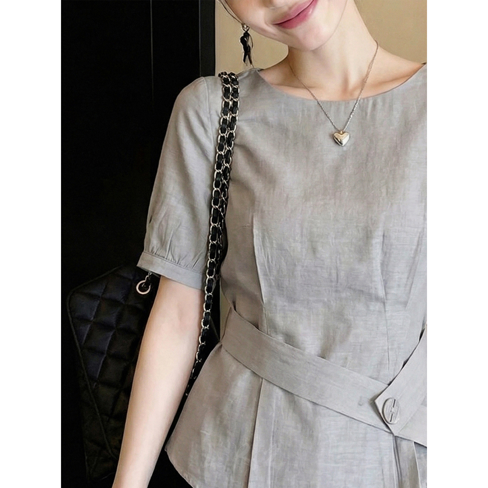 유럽 상품 고급 센스 불규칙 꼬집기 허리 반팔 셔츠 여름 새로운 허리 수축 슬림해 보이는 아니요 명중 섹션 회색 맨위