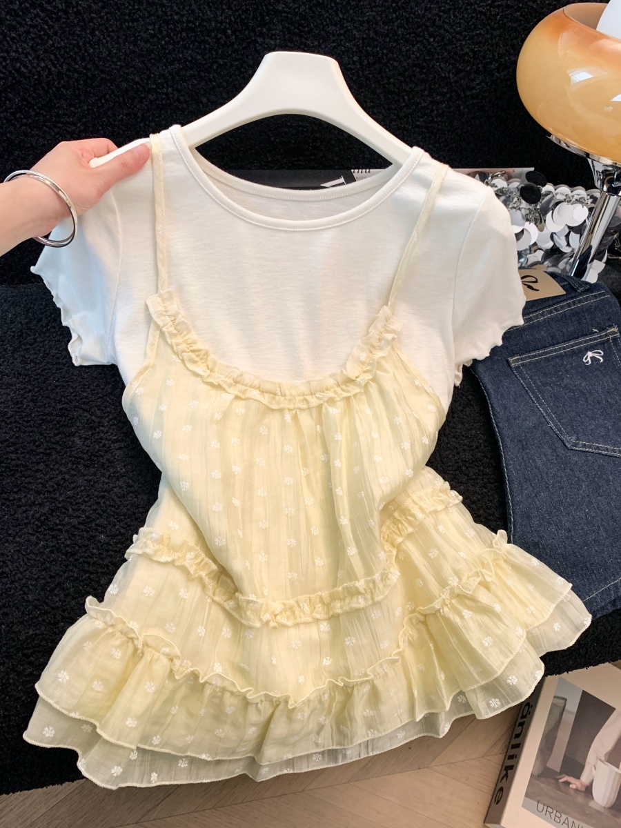 분위기 센스 세트 반팔 티셔츠 작은 청신 귀 꽃무늬 슬립 투피스 세트 스택 착용 맨위