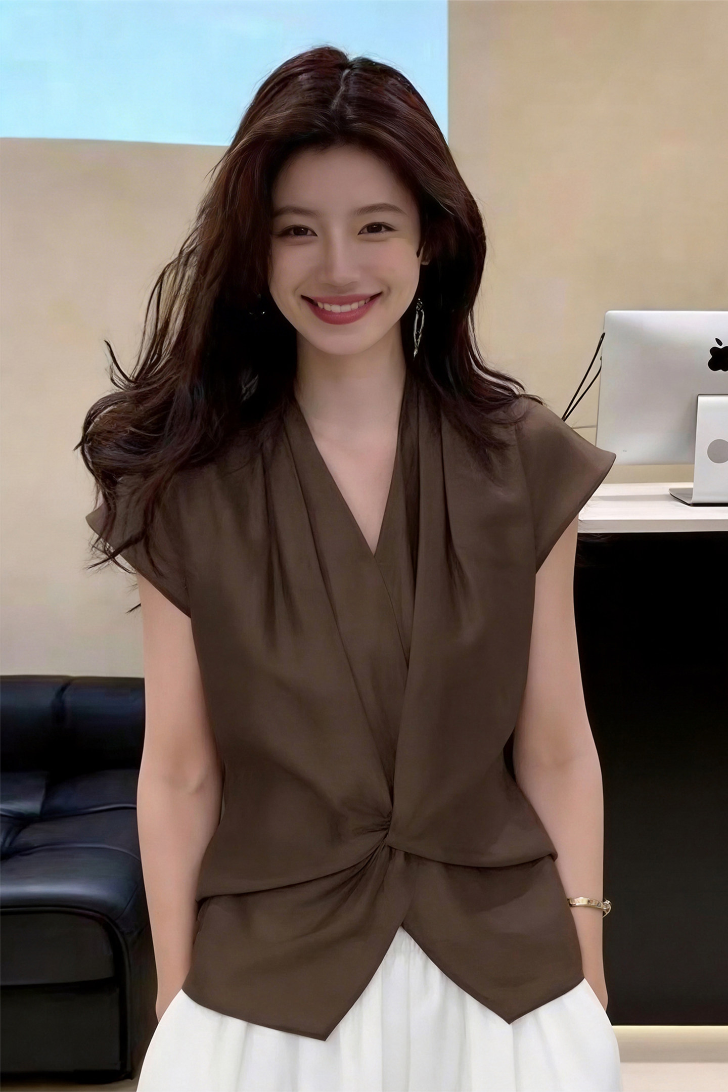 V넥 비틀림 허리 수축 쉬폰 블라우스 2026 여름 새로운 슬림해 보이는 출퇴근 다크 브라운 일상 다용도 반팔 맨위