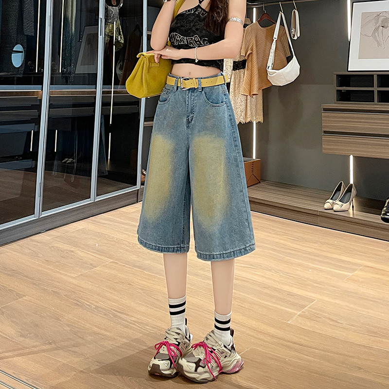 실사 살구 색상 핫걸 넓은 다리 데님 반바지 여성 여름 얇은 스타일 하이웨이스트 슬림해 보이는 루즈핏 작은 키 스트레이트 핫 바지